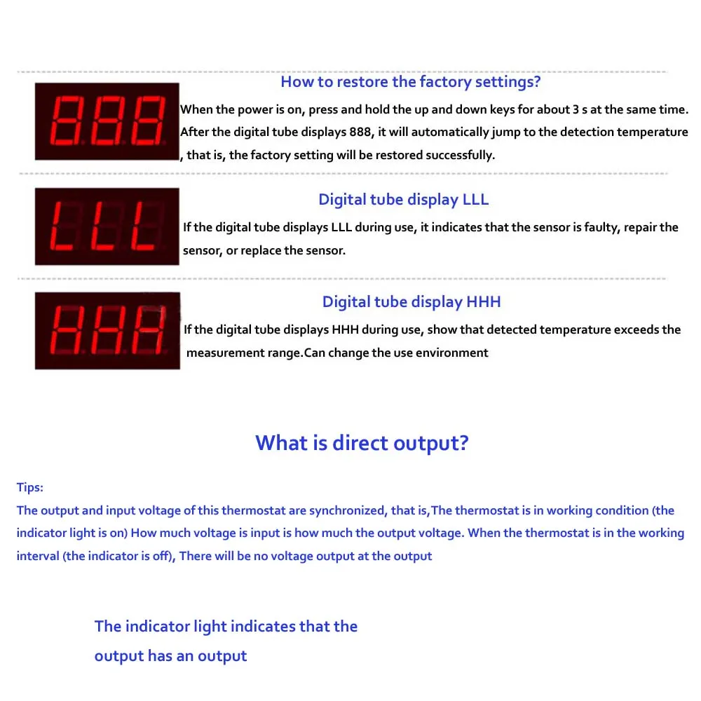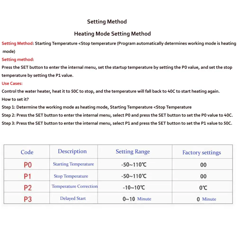 Запуск задержки настройки P3: Введите внутреннее меню таким же образом, переключитесь в P3, нажав кнопку вверх/вниз, нажмите кнопку настройки снова и установите Требуемое время задержки (минуты) нажимая кнопки вверх/вниз. При установке режима нагрева, если вы случайно инвертируете установленное значение температуры, Выходной индикатор не включит светильник, нагрузка не будет работать, если вышеуказанные условия появятся после завершения настройки, вы можете проверить, соответствует ли критическое значение температуры или нет.
