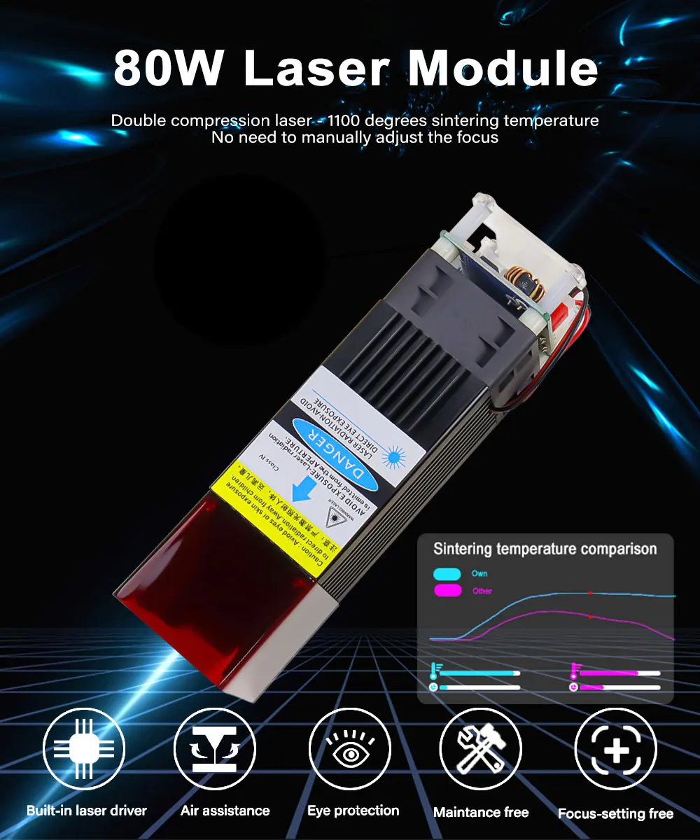 Модуль 80 Вт: с технологией FAC и защитной крышкой на лазерной головке, резка 8 мм фанеры/красочный акрил; Резьба по дереву, пластмассе, бумаге, бамбуку, рожку быка, коже, губчатой бумаге, камень, нержавеющая сталь и т. Д.