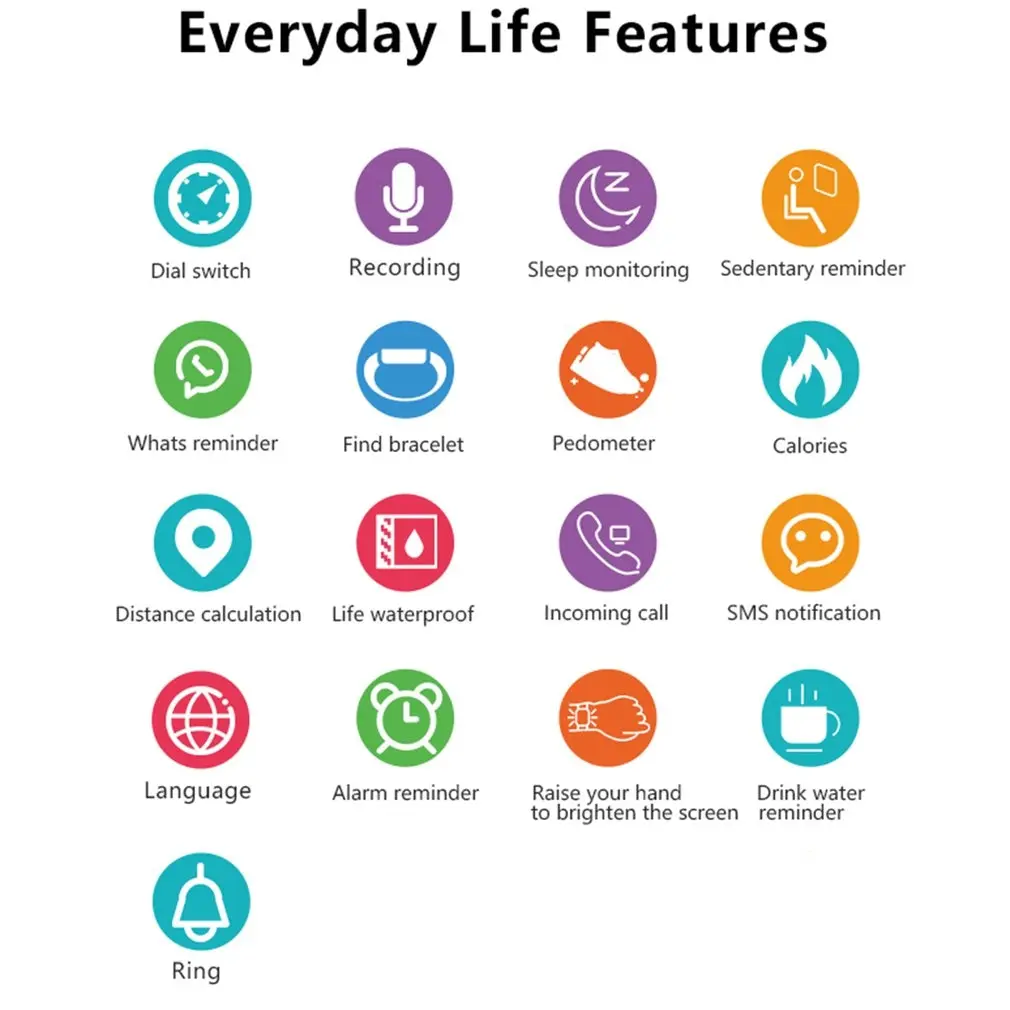 5. Водонепроницаемость: Эти Смарт-часы имеют Водонепроницаемость IP67. Точный дизайн конструкции, беззаботное ношение, поэтому вы можете носить ручную стирку, дождь и легко адаптироваться к различным условиям.