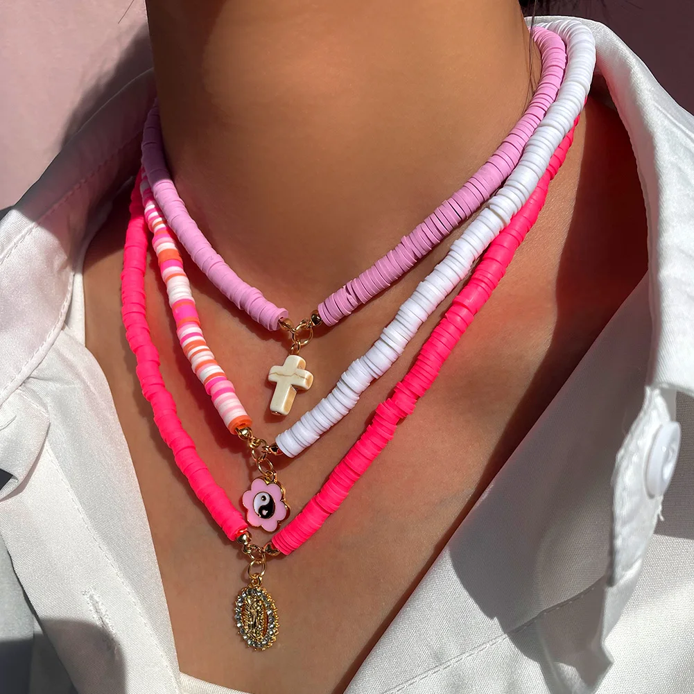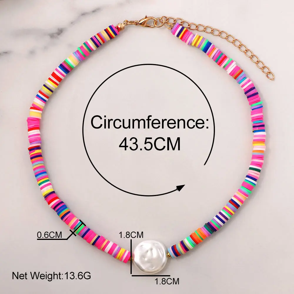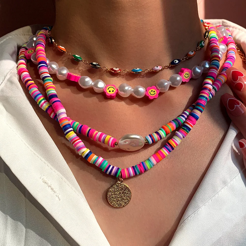 Женское ожерелье ручной работы, ожерелье в богемном стиле с розовыми полосками и бусинами из глины, ожерелье-чокер со смайликом и искусственным жемчугом, Ювелирное Украшение