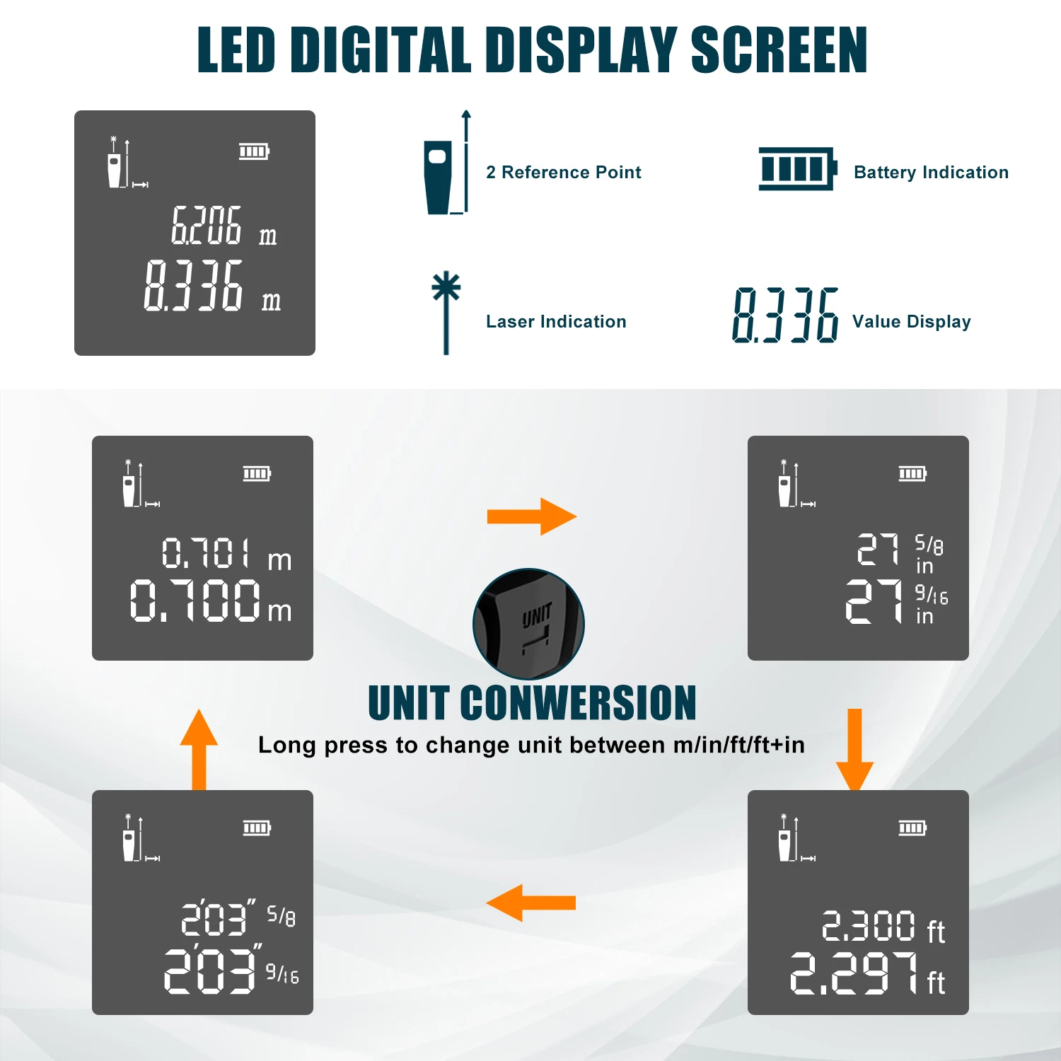 3. Универсальные кнопки и простота в эксплуатацииЦифровая лазерная мера имеет 3 кнопки. Кнопка меню предназначена для переключения режима измерения и истории просмотра. Кнопка измерения предназначена для измерения, включая непрерывное измерение. Последняя кнопка для переключателя M/In/Ft и измерительного переключателя. Три кнопки обеспечивают больше функций и больше удобства, что делает вашу работу намного проще.