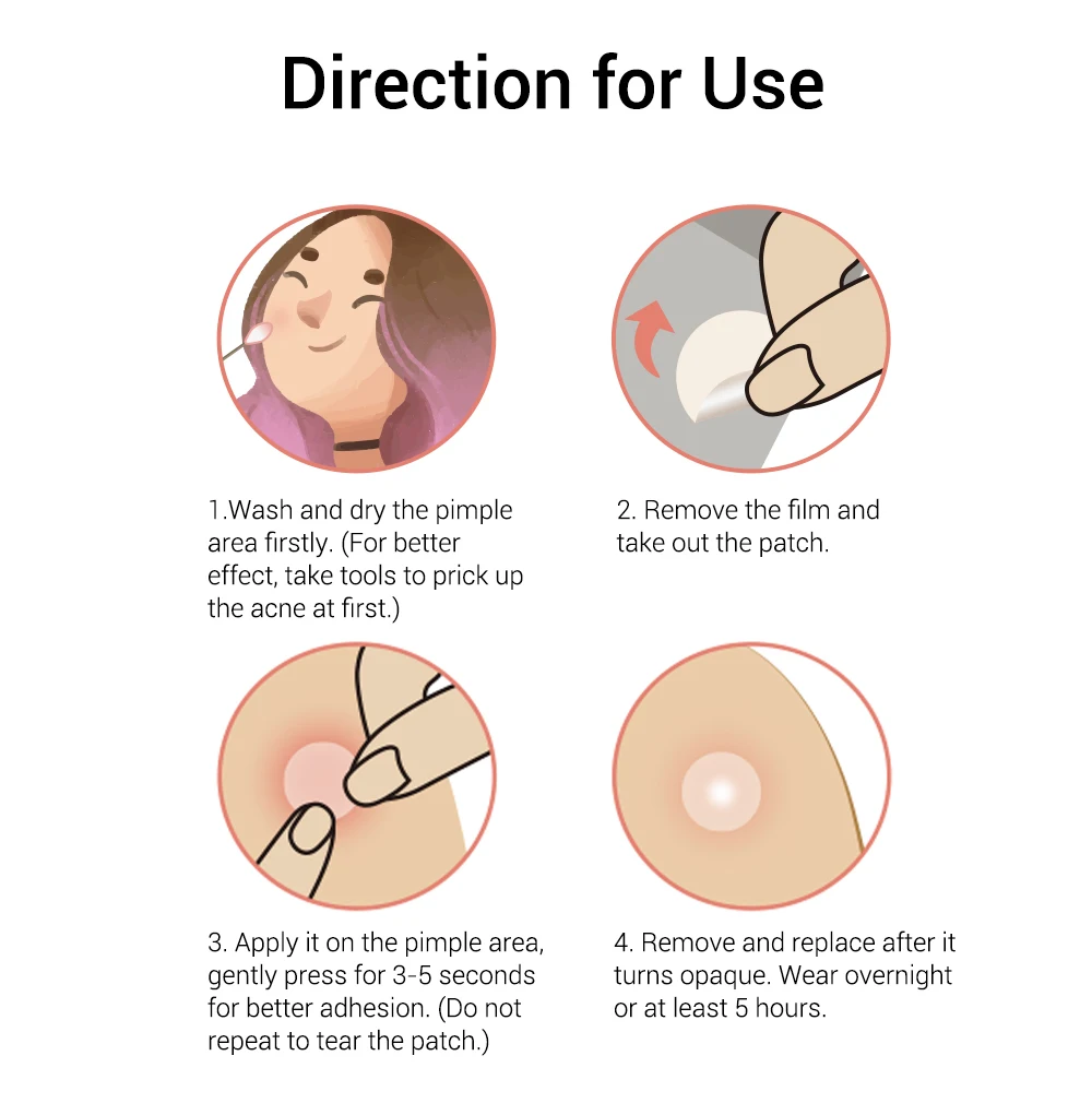 3. Нанесите его на область прыщей, аккуратно нажмите в течение 3-5 секунд для лучшей адгезии. (Не повторяйте, чтобы оторвать пластырь.)