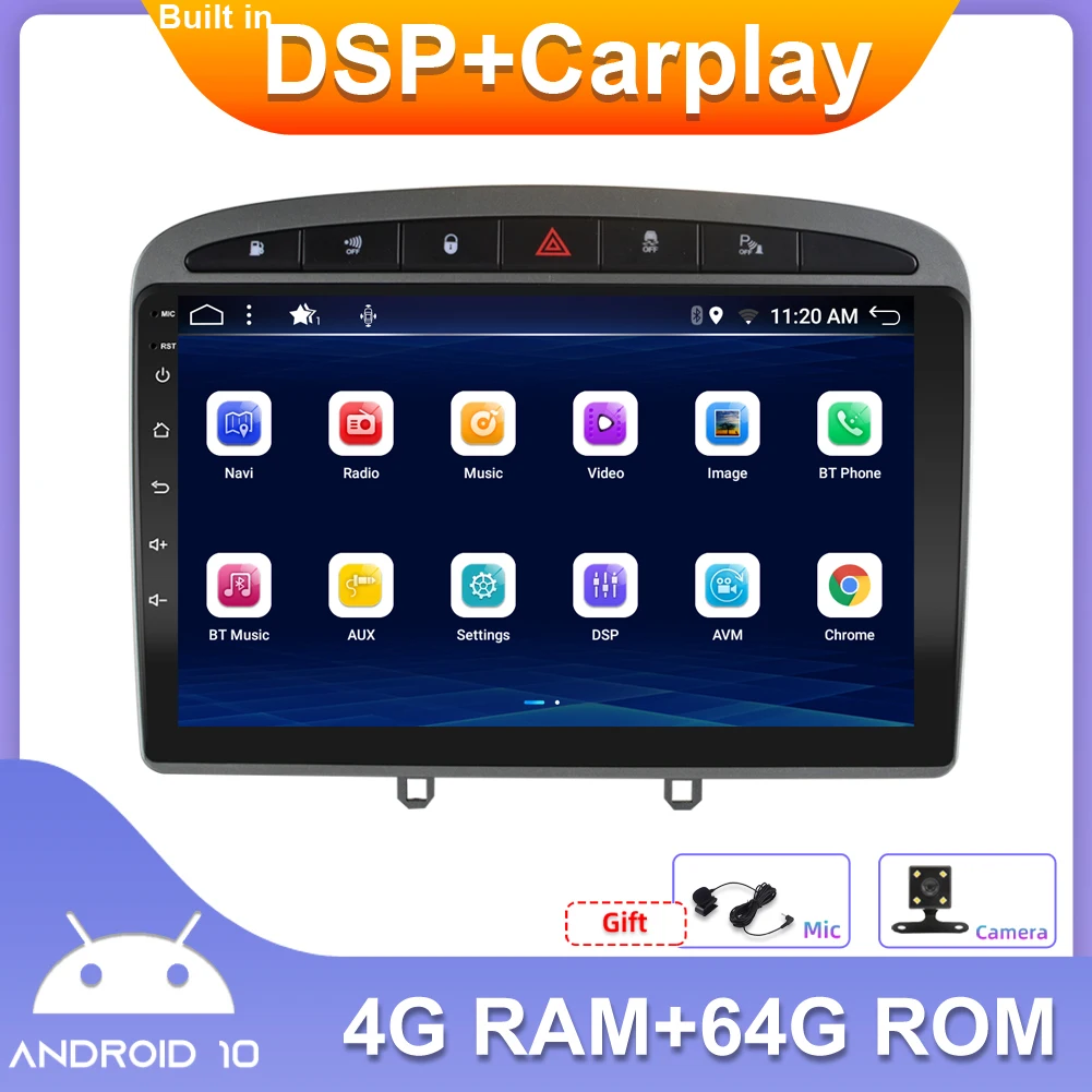 Мультимедийный проигрыватель, 9 дюймов, 2 Din, Android 10, GPS-навигатор для Peugeot 308, 2008-2010, DSP, Carplay, 4G + 64G