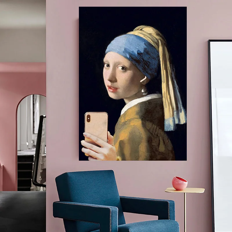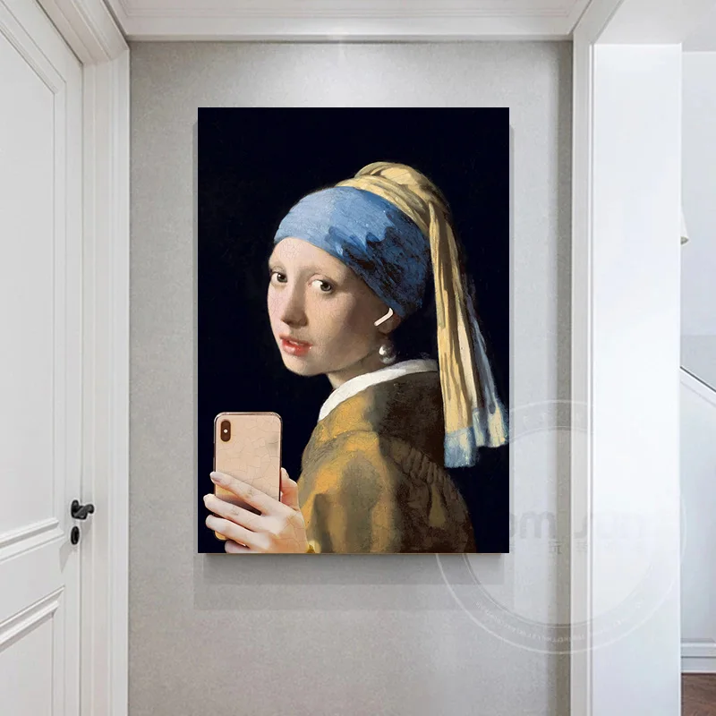 Веселая художественная девушка с жемчугом Серьги селфи по телефону плакаты и принты абстрактный портрет картина маслом на холсте Фотообои