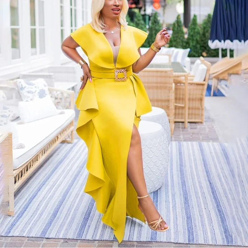 Элегантные вечерние платья, женские сексуальные платья с v-образным вырезом, длинные платья с разрезом, Платье макси с оборками размера плюс, халат, женская одежда 2021
