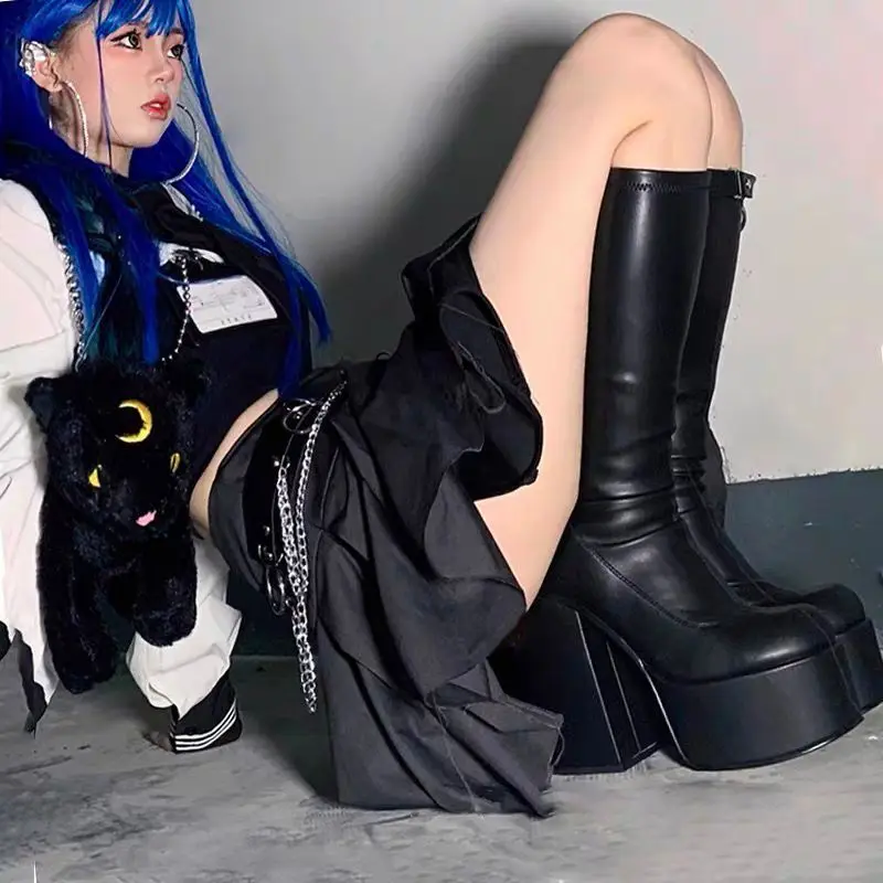 Сапоги до колена в стиле панк; Ботинки осень-зима; Обувь на платформе; Женские ботильоны на высоком каблуке; Черные женские высокие сапоги на толстой платформе