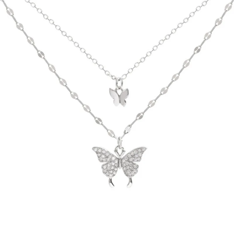 Двухслойное ожерелье серебряного цвета с бабочкой и мигающими брилл...