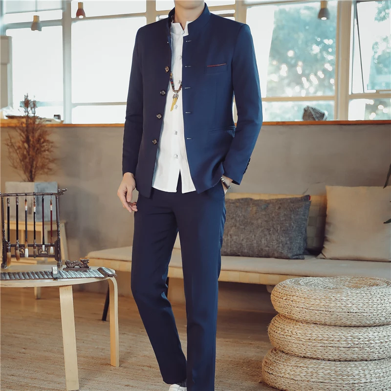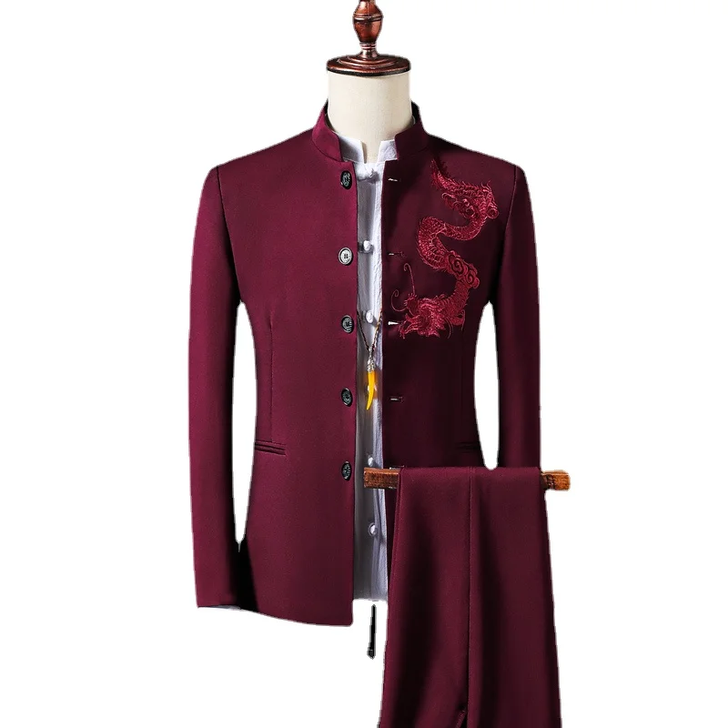 Новинка 2021, мужской облегающий костюм в китайском стиле, черный, серый, винно-красный, свадебные костюмы для мужчин