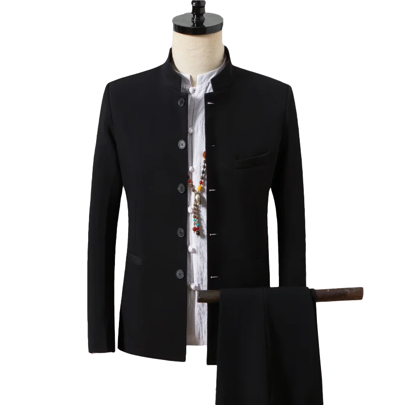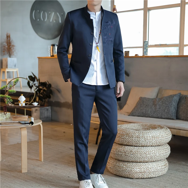 Костюм с вышивкой и воротником-стойкой в китайском стиле, черныевин...