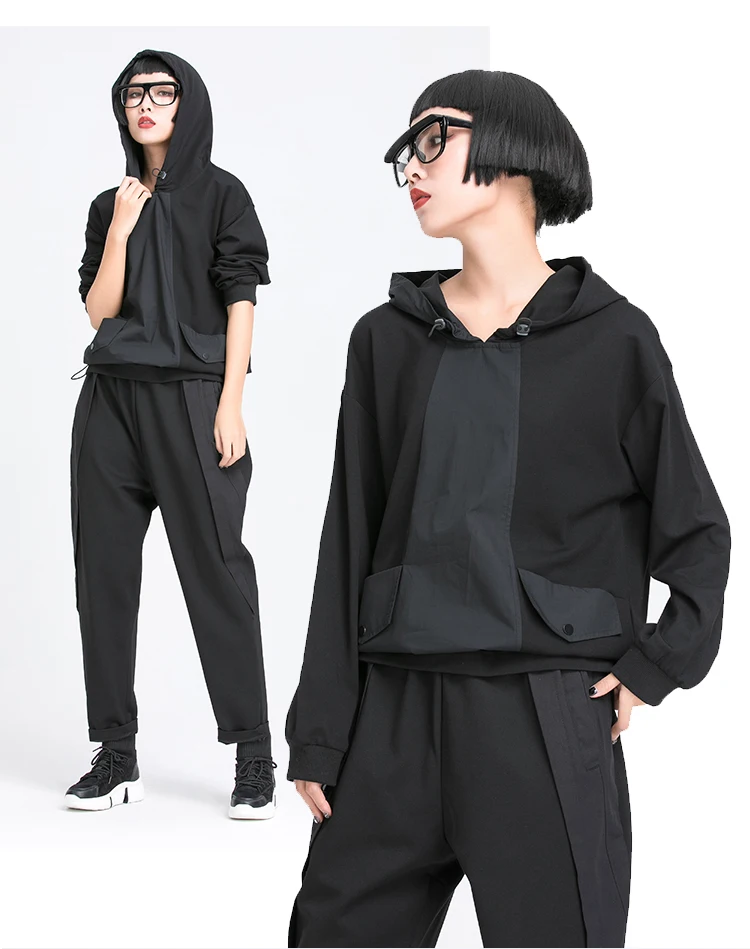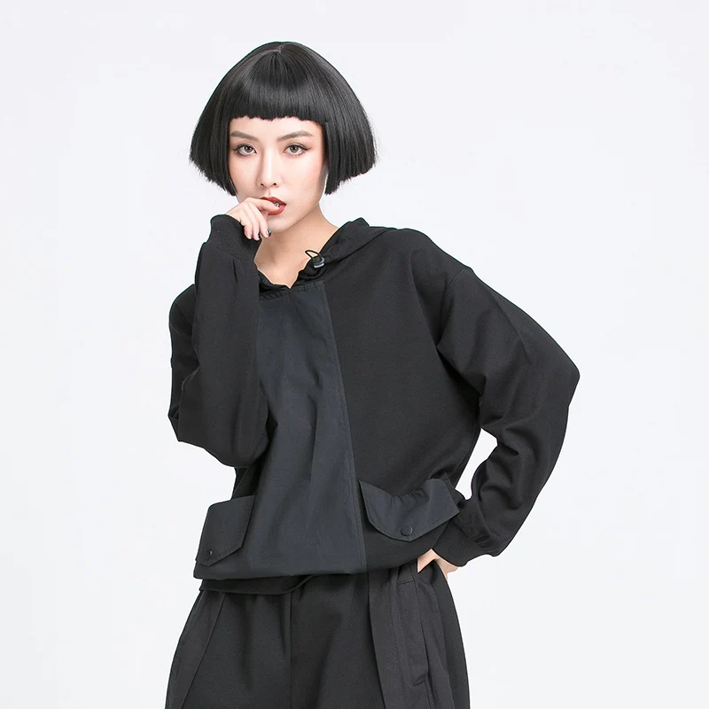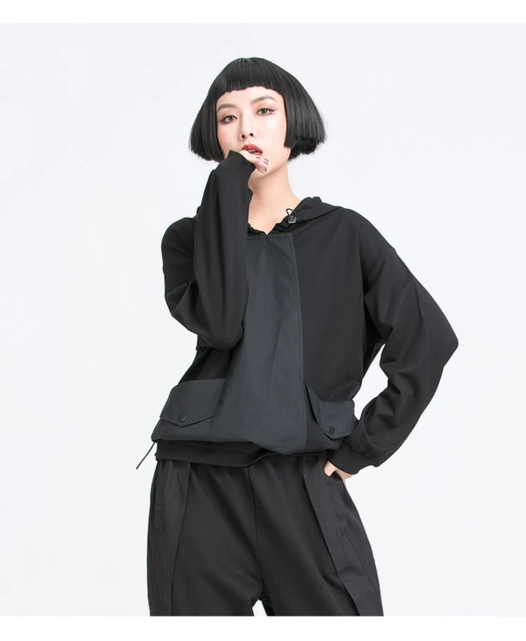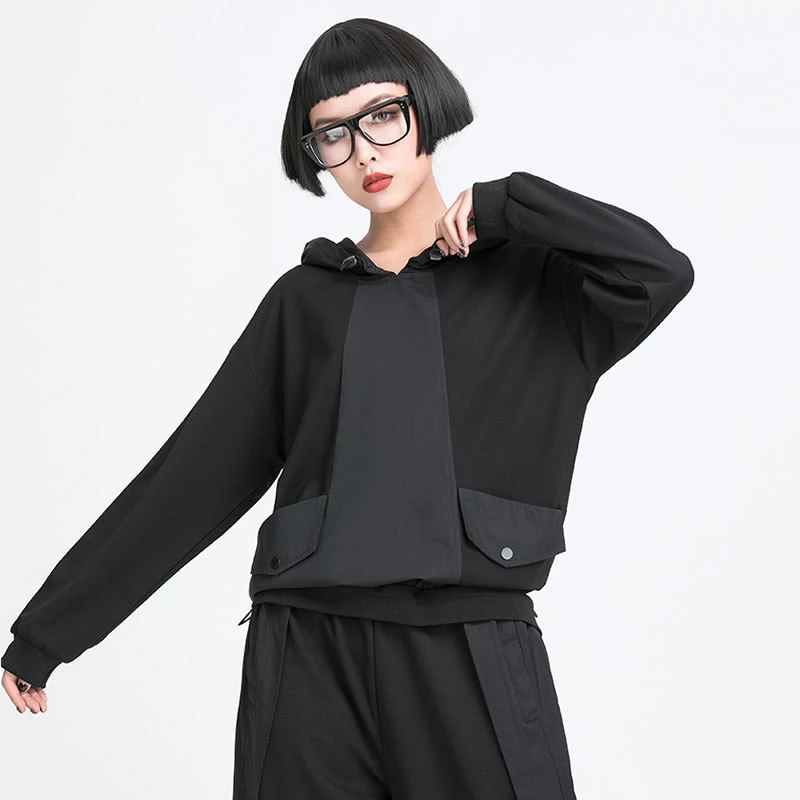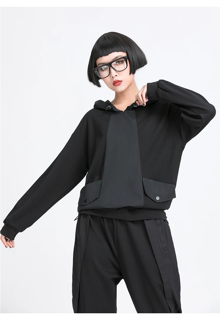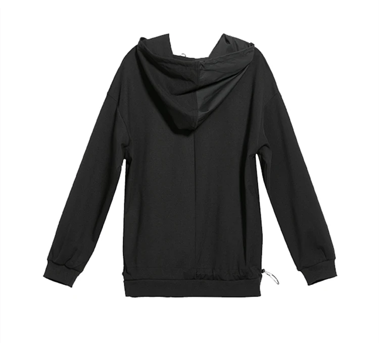 Толстовка Женская, черная, с капюшоном, с длинным рукавом, в стиле пэчворк, весна-осень, 2021