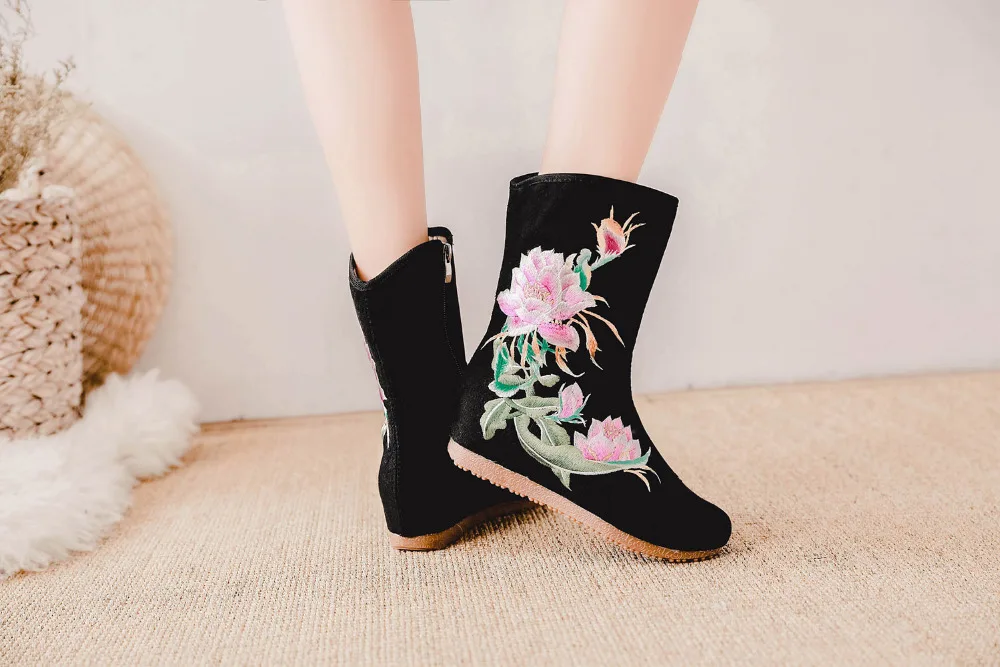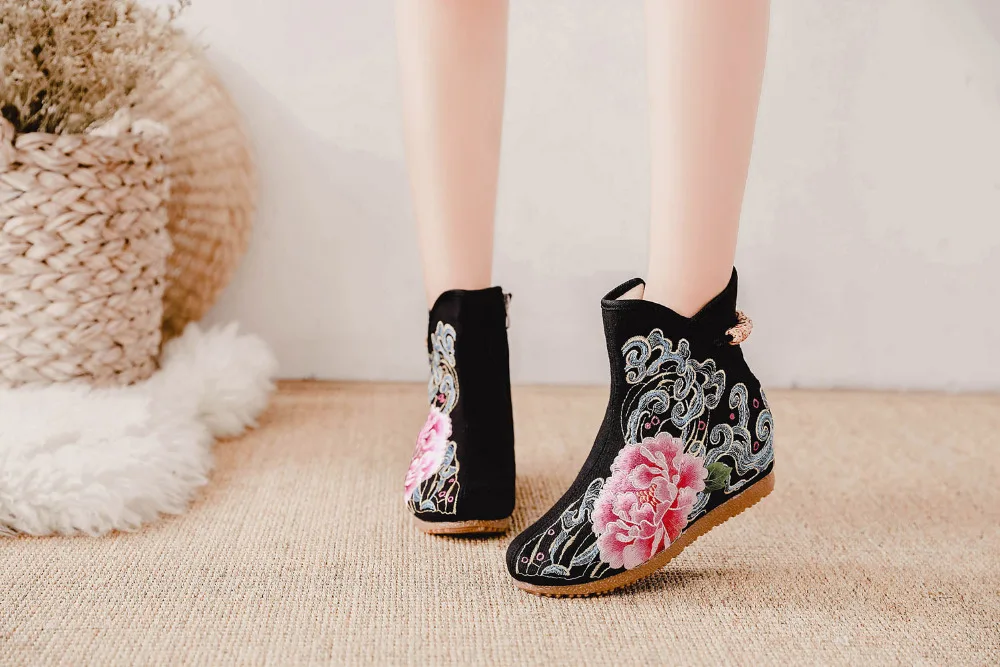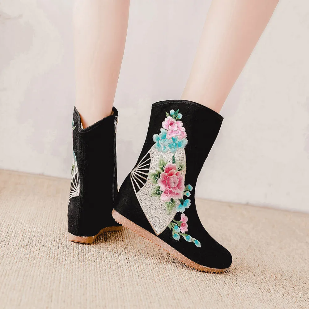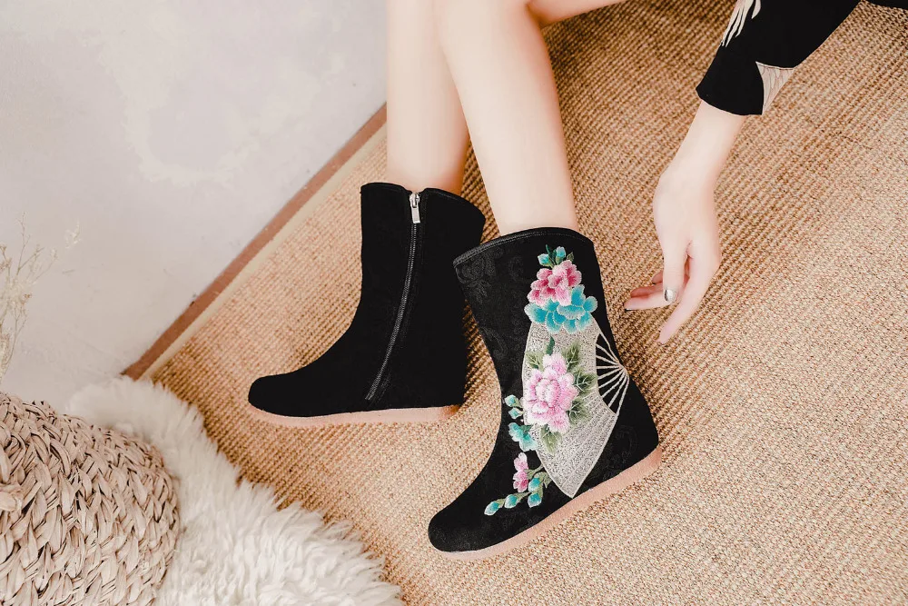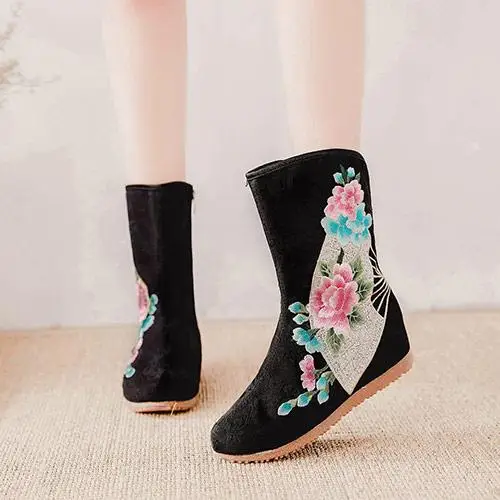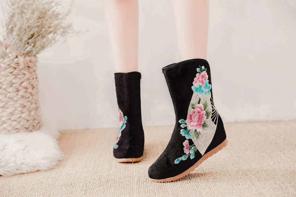 Ботинки женские холщовые с цветочной вышивкой, винтажные удобные джинсовые ботинки на скрытой танкетке, хлопок, черные, Осень-зима