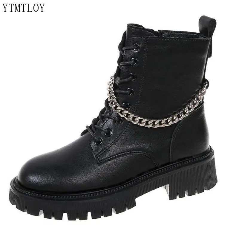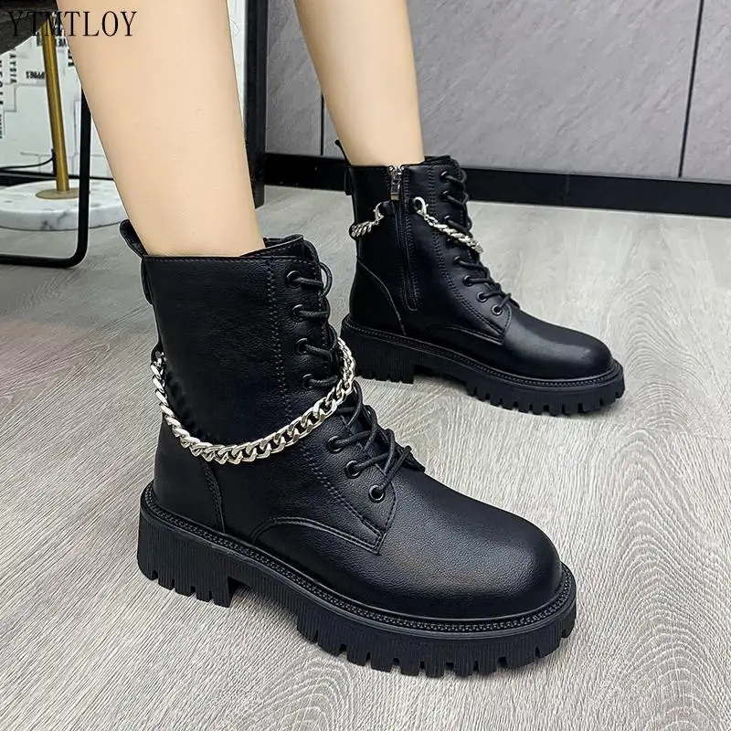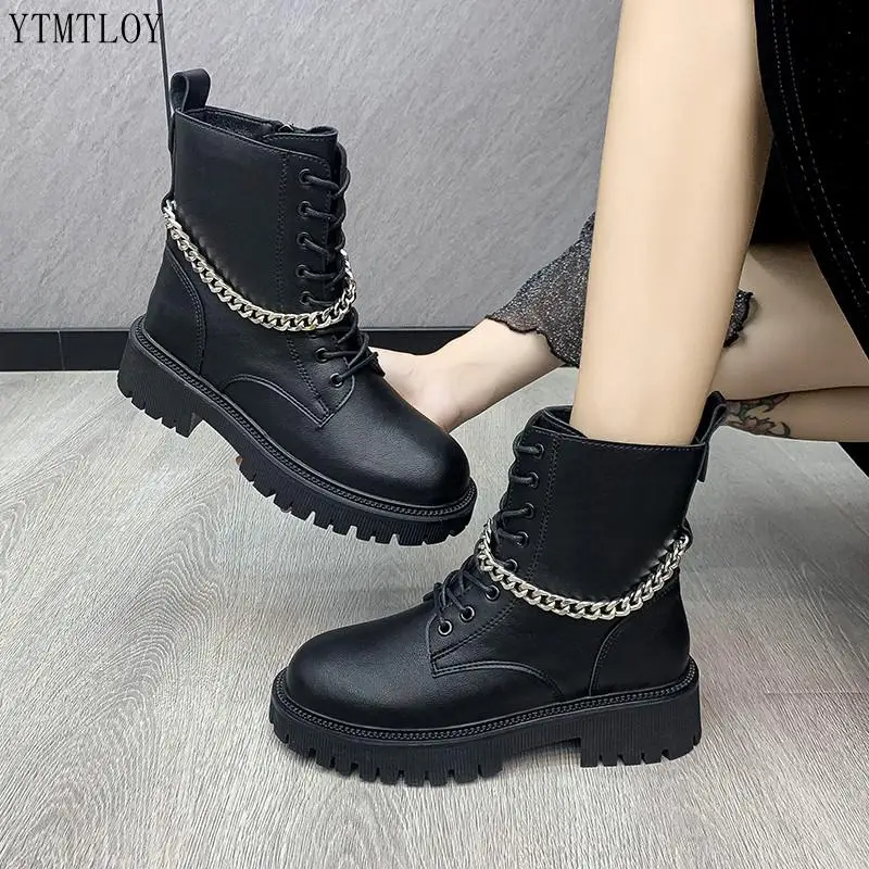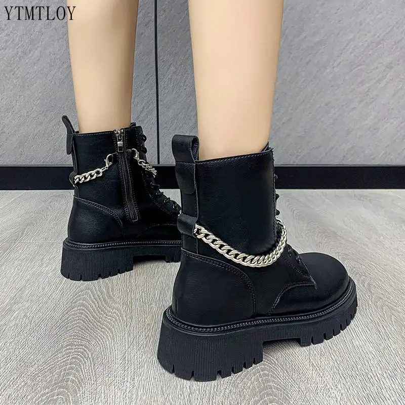 Осенние мотоциклетные ботинки с металлической цепочкой 2022, Модные Черные ботильоны на толстой нескользящей подошве и платформе, пикантные ботинки Ytmtloy с круглым носком