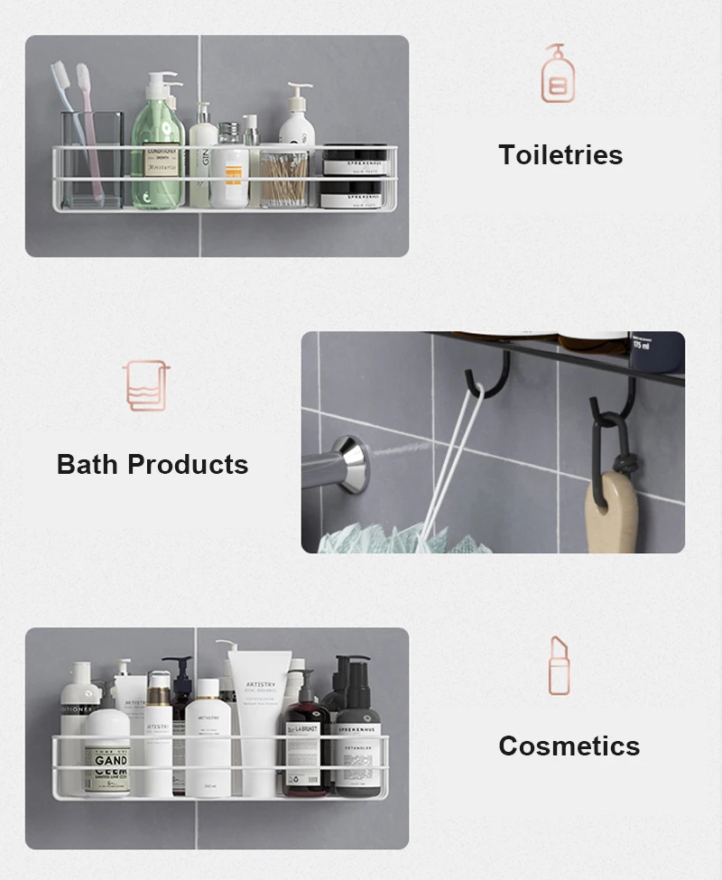 Название: Домашний Органайзер настенная вешалкаМатериал: железоЦвет белый, черныйОсобенности1. Изготовлен из железа, хороший подшипник.2. Без сверл, без дырочек, настенный, бесследный самоклеящийся настенный стеллаж.3. Многофункциональность. Органайзер для ванной комнаты, кухонный органайзер, держатель для приправ, полка для унитаза, стойка для хранения душа, Полка для полотенец.