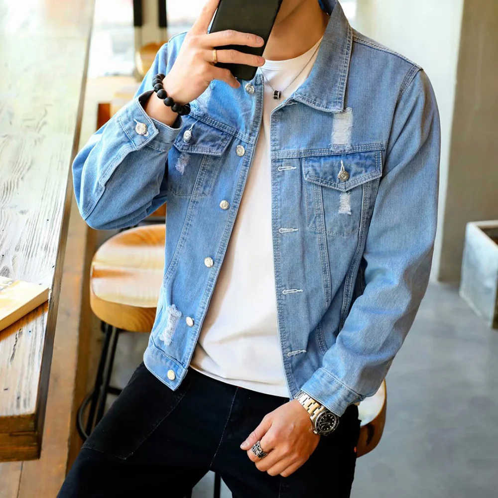 Джинсовая куртка мужская с дырками, ковбойская куртка в стиле хип-хоп, приталенный силуэт, джинсы с вареным эффектом, уличная одежда, весна-осень