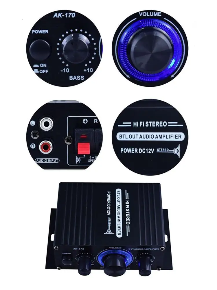 Мини HIFI аудио усилитель мощности. Два основных канала выхода.Выходы левого и правого каналов являются интерфейсами для динамиков или динамиков.Низкое Искажение обеспечивает более четкий, сильный и мощный звук.Изготовлен из алюминиевого сплава, толстый, приятный на ощупь.Большой ручки спроектированы с синий светодиодный свет tomake продукты больше и красиво.Характеристики:Название продукта: усилитель мощностиЦвет: черныйМатериал: алюминиевый сплавВходное напряжение: 12 В постоянного токаМощность RMS: 20 Вт + 20 ВтМаксимальная мощность: 200 Вт + 200 ВтКанал: 2CHСопротивление нагрузки: 4-16ΩSNR: 90 дБЧастота: 20 Гц-20 кГцЧастота искажений: 0.01%Размер: около 125x75x40 мм (Д * Ш * В)Посылка включает в себя:1 шт. x усилитель мощности1 шт. Руководство пользователя
