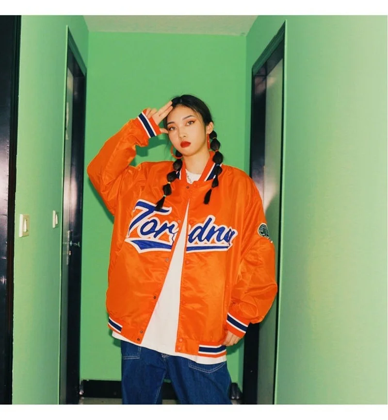 Винтажная Оранжевая Куртка-бомбер с вышивкой, осень 2021, бейсбольн...