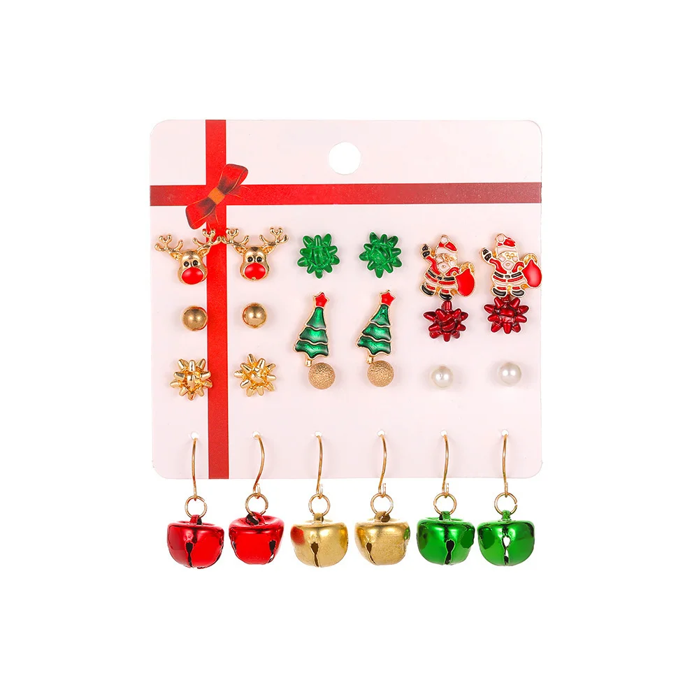 Набор женских сережек, 12 пар, в рождественском стиле, с Санта-Клаусом, лосем, снежинкой, бантом, колокольчиками и бриллиантами