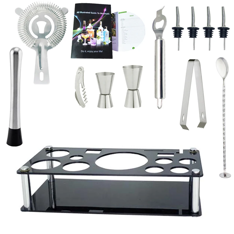 Набор включает в себя несколько предметов, необходимых для смешивания напитков, поставляется с подставкой для вина с прорезями для удобного хранения.