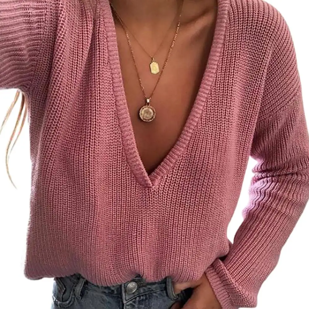 Женские пуловеры с длинным рукавом, однотонный вязаный свитер, джемпер с глубоким V-образным вырезом, пуловер на осень и зиму, повседневный Свободный Вязаный топ, 2021