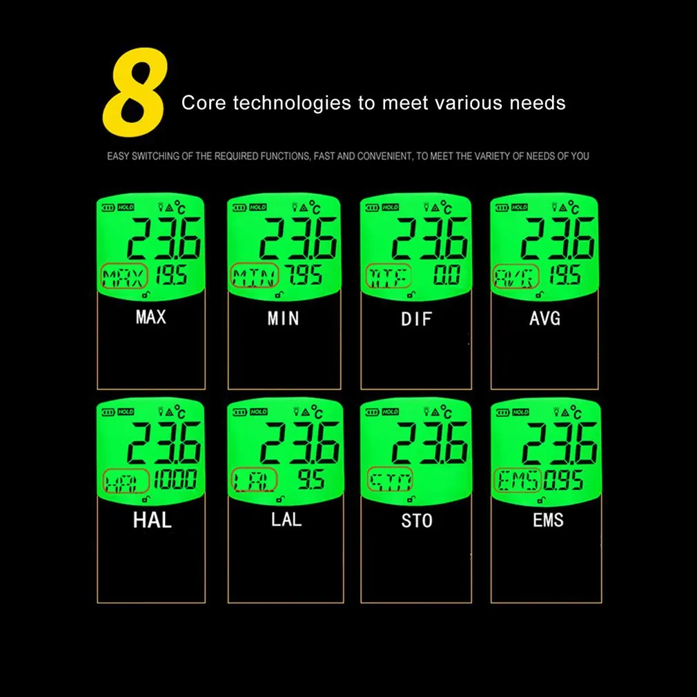 5. Больше преимуществ: лазерный сигнал, вызов данных, Высокий/Низкий сигнал тревоги, максимальное/минимальное/среднее измерение, измерение разницы.