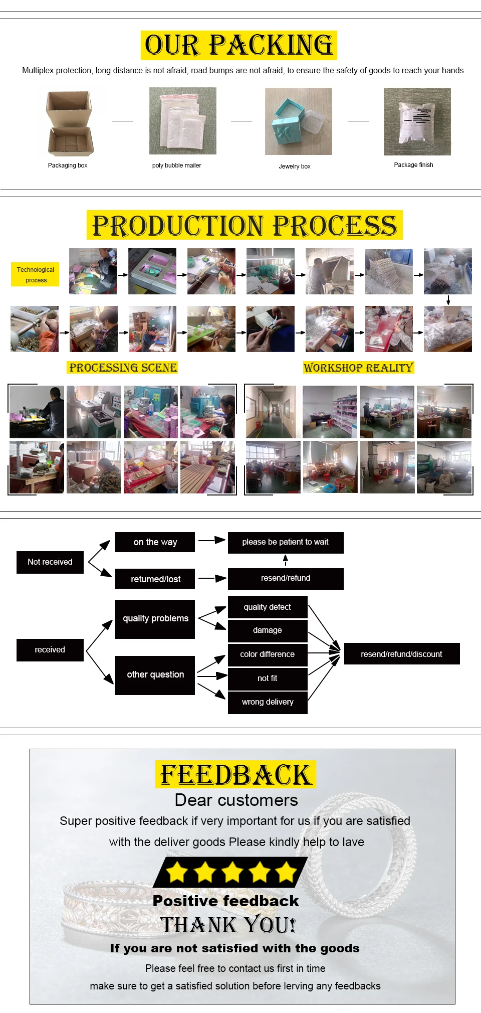 Обслуживание ювелирных изделий: * Если существует аллергия, прекратите носить. Это модное ювелирное изделие, а не настоящее чистое золото/серебро * Держите этот продукт в недоступном для маленьких детей месте. * Уменьшает пот на ощупь. * Снимите ювелирные изделия во время купания, стирки. * Избегайте смешивания с другими ювелирными изделиями или твердыми вещами. * Часто чистите его. * Например, больше пота или купания. ... И т. Д., повлияет на изменение цвета. Отгрузка: Мы отправим товар в течение 4 дней после подтверждения оплаты. AliExpress Стандартная доставка 15-60 дней в большинство стран. Оптовые заказы, мы можем бесплатно договориться FedEx, DHL или UPS. Отзывы: Пожалуйста, не оставляйте отрицательные (1-2 звезды) или нейтральные отзывы (3 звезды), прежде чем связаться с нами. Ваше удовлетворение-наша цель! Негативные или нейтральные отзывы-это очень серьезная позиция, и мы гарантируем, что сможем решить вашу проблему, прежде чем оставлять отрицательный отзывы. Мы надеемся, что вам понравятся наши товары и вы насладитесь покупками, а также надеемся, что вы оставите нам положительные отзывы. Спасибо! Импортная пошлина: Налоги и сборы не включены в стоимость товара и стоимость доставки. Если в вашей стране необходимо оплатить таможенную пошлину, это ваша честь и ответственность. Несоответствие цвета: Различия в цвете могут быть вызваны какими-то другими причинами, такими как отражение цвета в мониторе, освещение, фон и т.д. Возврат: Мы предлагаем каждому клиенту самые лучшие товары из нашего ассортимента. Мы вернем вам деньги за товары, возвращенные в течение 7 дней с момента получения, для проблем с качеством. Полный возврат будет предоставлен, если товары будут возвращены в их первоначальном состоянии. Товар, который поврежден или отсутствует, не возвращается. Покупатели несут ответственность за обратную доставку в надлежащей упаковке. При получении товаров мы немедленно вернем вам деньги. Перед возвратом товаров, пожалуйста, убедитесь, что вы получили наш (продавец) адрес возврата, и напишите «подарок» на листе деталей доставки.
