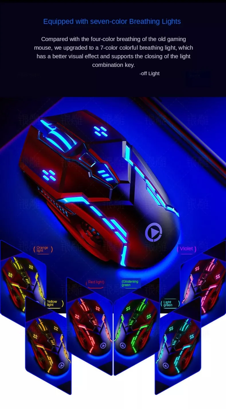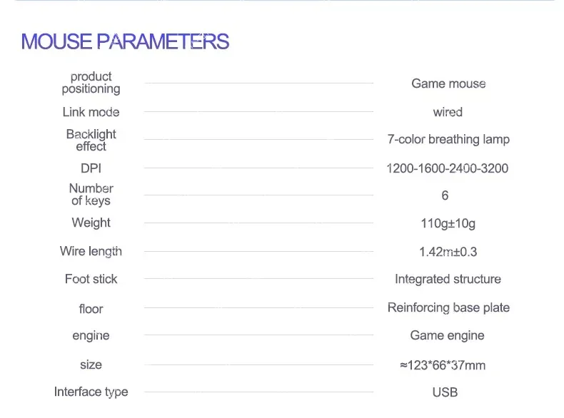 Высококачественный оптический двигатель, точное позиционирование.6 кнопок, включая кнопки: влево, вправо, колесо прокрутки, DPI , Advance и outside (при посещении веб-сайта)Регулируемый 1200 / 1600 / 2400 / 3200DPI.Эргономичный дизайн, удобный на ощупь, длительное использование без усталости.Интеллектуальное подключение, подключи и работай.Длительный срок службы переключателя до 10 миллионов.Всего 7 ярких цветов показаны по очереди, что дает вам красочный визуальный эффект.Подходит для высококлассных игроков, профессиональных геймеров.Материал: АБС-пластикСистема отслеживания: оптическаяНоминальное напряжение/электрический ток: 5 В/100 мА постоянного токаПодключение: ПроводноеДлина кабеля: прибл. 140 смDPI: 1200/1600/2400/3200dpi.Срок службы переключателя: 10 миллионов цикловКнопки: влево, вправо, колесо прокрутки, DPI , Advance,Эффект на светильник: яркийРазмер товара: 12,3*6,6*3,7 см (Д * Ш * В)Вес изделия: 110 гПосылка Вес: 150 г