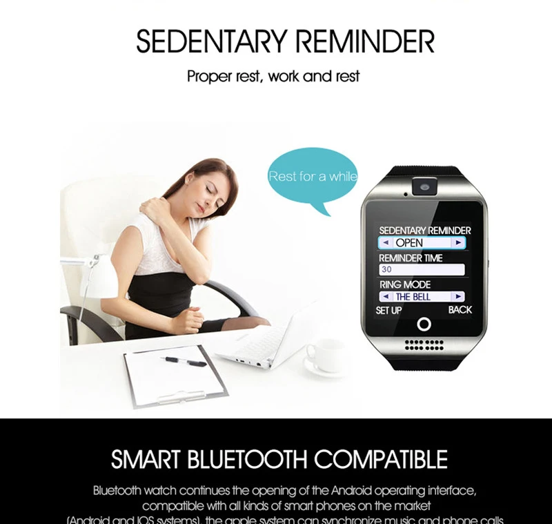 Функция:Функция вызова: GSM/GPRS 850/900/1800/1900 четыре частоты разговора, циферблат, свободные руки, телефонные записи, телефонная книга, Bluetooth телефон.SMS местные SMS: текстовые сообщения на мобильных телефонах синхронно нажимаются по bluetooth (для мобильных телефонов android).Развлечения: MP3; Воспроизведение музыки по bluetooth; Напоминания о телефонных звонках; Напоминания о звонках и вибрациях.Двунаправленный: анти-потеря, потеря напоминания, двунаправленный поиск.Шагомер: запись шагов движения, расчет калорий, запись пробега движения.Напоминание о малоподвижности: напоминание о малоподвижности.Мониторинг сна: мониторинг сна.Фотографирование: просмотр фотографий; Хранение памяти; Изображения: PNG, JPG.(сначала нужно вставить sim-карту)Мобильные телефоны с дистанционным управлением: хранение на мобильные телефоны; Изображения: PNG, JPG.(сначала нужно вставить sim-карту)Другие: будильник, календарь, секундомер, калькуляторы, управление сенсорным экраном, sms-уведомления (только поддержка android), удаленная камера (только поддержка android), защита от потери (только поддержка android), браузер, циферблат/ответ на вызов, монитор сна, шагомер, будильник, воспроизведение музыки, запись, напоминание о малоподвижности и т. Д.Передача информации по Bluetooth (для телефона android) whatsapp, Facebook, своевременная информация и т. Д.
