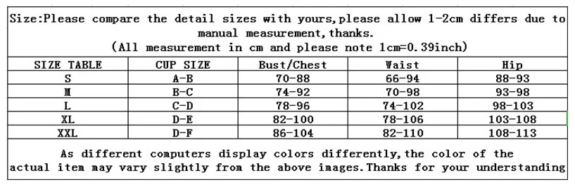 Item sizing is not corresponding. It is good looking but way too small for the size. for the XXL I received, the bra cap was A and the EU size correspond more likely to a 42EU than a larger one. disappointed but will make one of my friends happy