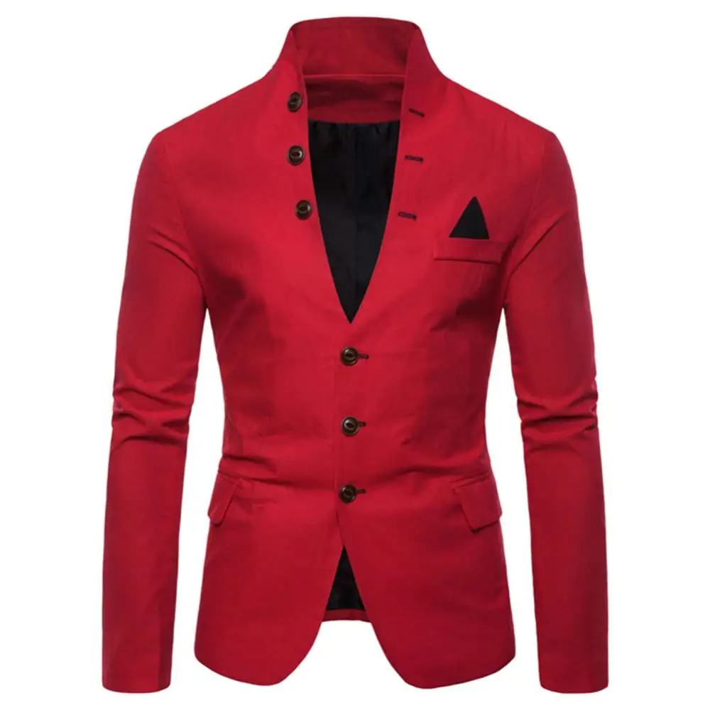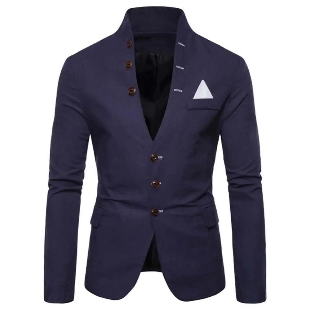 Пиджак мужской универсальный из полиэстера, блейзер с длинными рукавами и воротником-стойкой из спандекса, приталенный жакет с карманами и 3 пуговицами