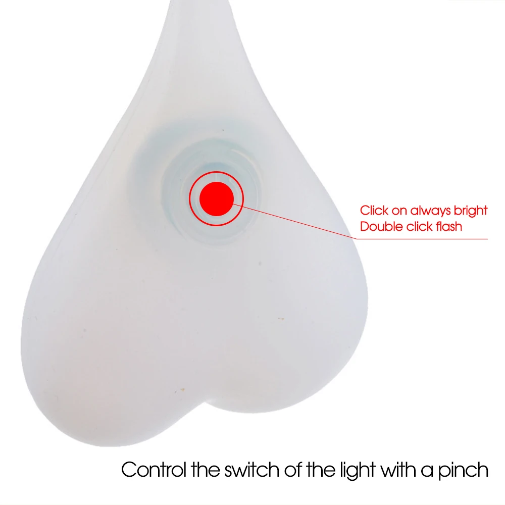 -- Этот велосипедный светильник-это новый продукт премиум класса, изготовленный из очень мягкой резины. Вы можете свободно тянуть его без деформации и повреждений.-- Этот велосипедный светильник имеет отсек для батареи внутри, вы можете изменить его в любое время. Однако для того, чтобы защитить срок службы светодиодный светильник, Замените аккумулятор во время уменьшения яркости.-- Велосипедный светильник управляется кнопкой включения, вы можете включить и выключить в любое время.-Велосипедный светильник выполнен в изящной и красивой форме сердца. Его можно использовать не только на велосипедах, но и на других предметах в жизни.-Велосипедный светильник из водонепроницаемого материала, также может использоваться в дождливые дни.