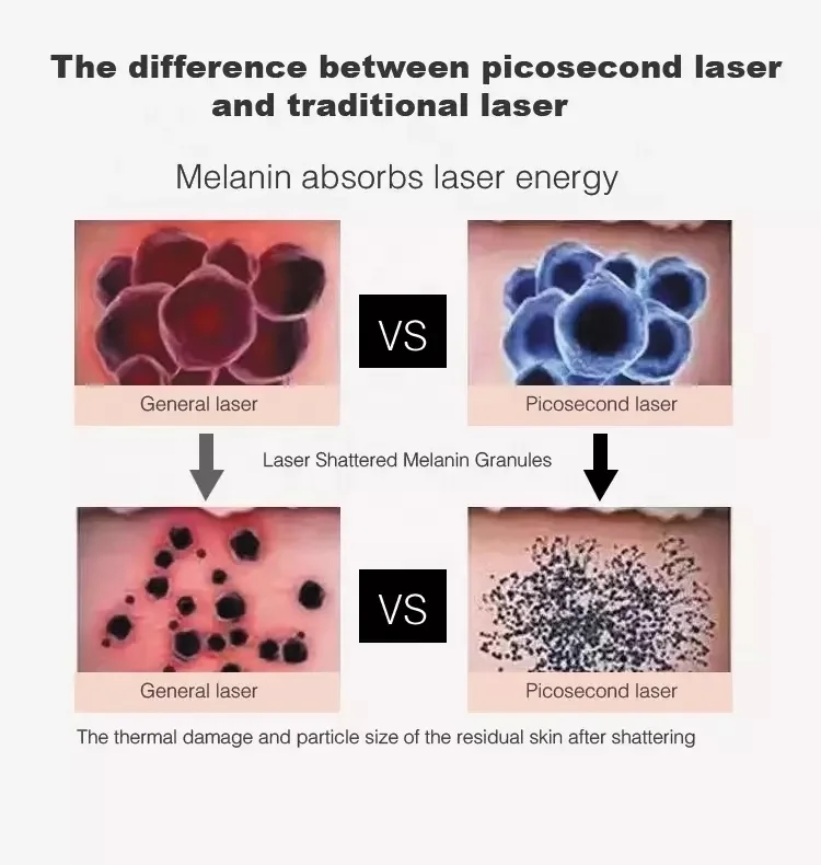 Лазер PicoSecond использует ультра-короткие импульсы (один триллион секунды в длину), чтобы ударить меланин большим давлением, меланин разбивается на крошечные частицы, похожие на пыль. Поскольку частицы такие маленькие, они более легко впитываются и устраняются организмом. Это может означать лучшее Очищение меланина и меньшее количество обработок в целом.Пикосекундный лазер-это быстрое и легкое нехирургическое, неинвазивное лазерное лечение кожи для тела, включая грудь или декольте, лицо, руки, ноги и многое другое.