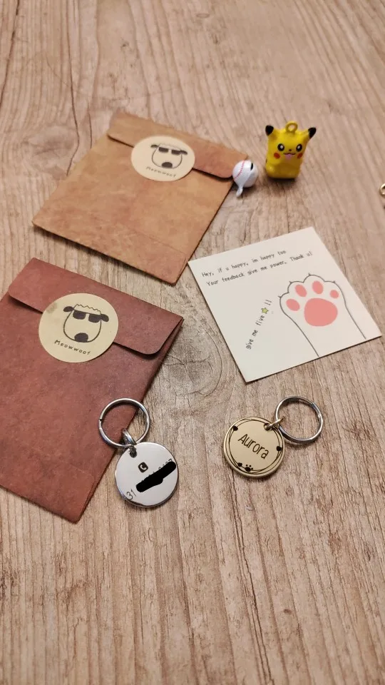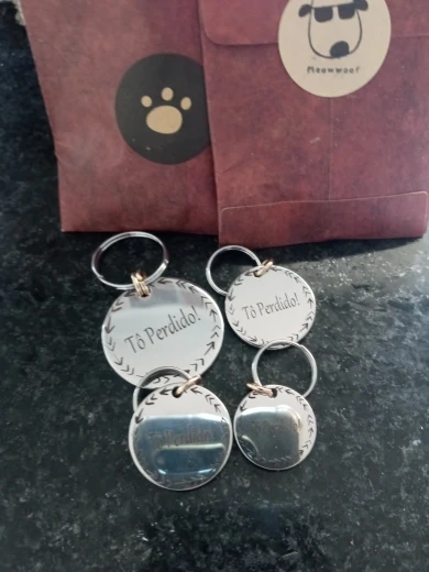 Быстрая доставка и хороший контакт с продавцом. Поставляется с маленькими кольцами, чтобы прикрепить его к вашему брелку или ошейнику. Каждая бирка также поставляется с небольшим звонком. :) качество выглядит и кажется хорошим. 29 мм блестящая сталь (брелок) и 19 мм промышленная сталь (кошачий ошейник). Шрифт 9, стиль узора 4 и рисунок нет.