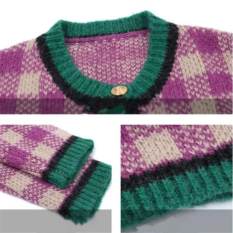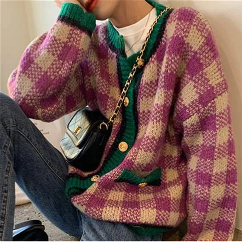 Кардиган женский вязаный в клетку, с длинным рукавом, винтажный стиль, зима 2021