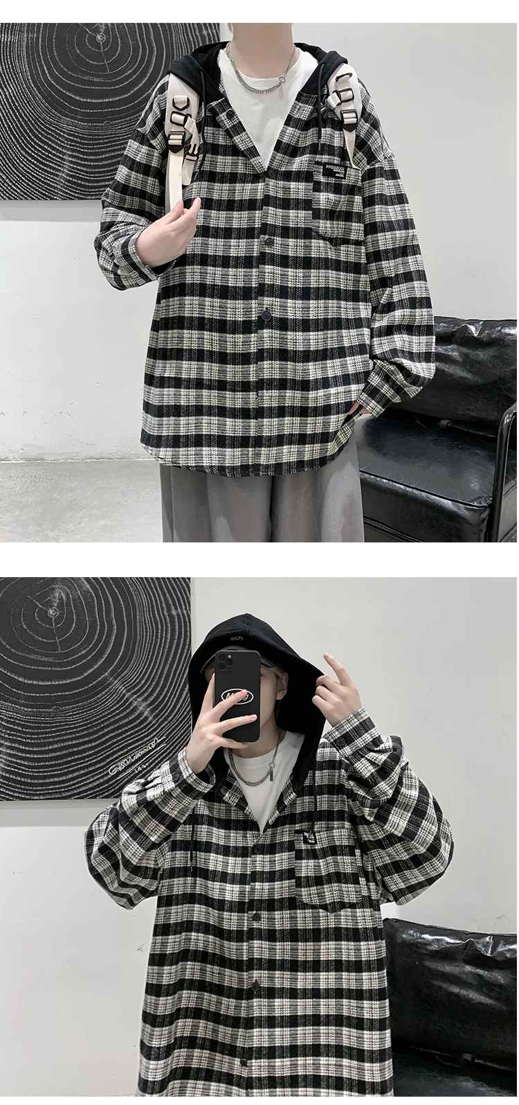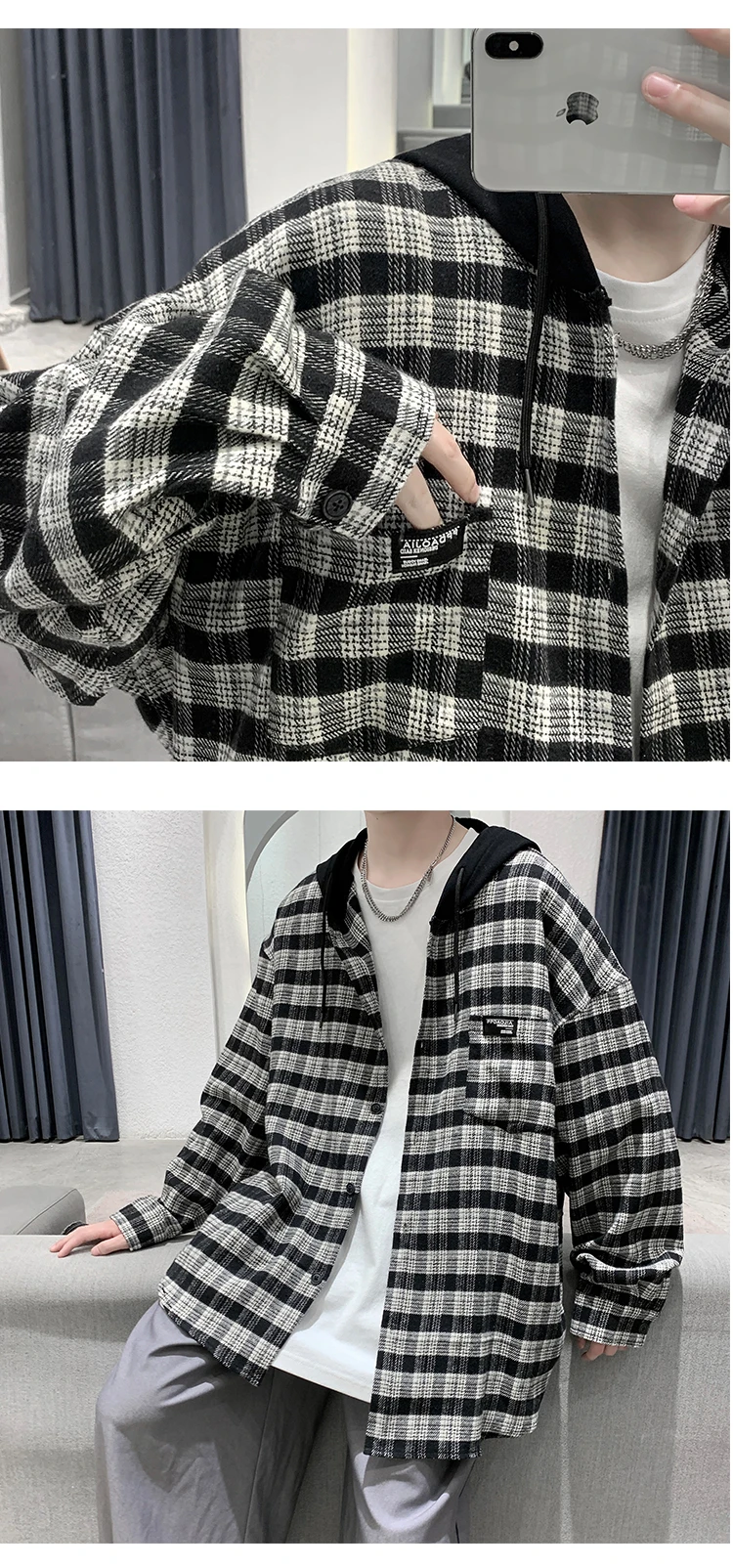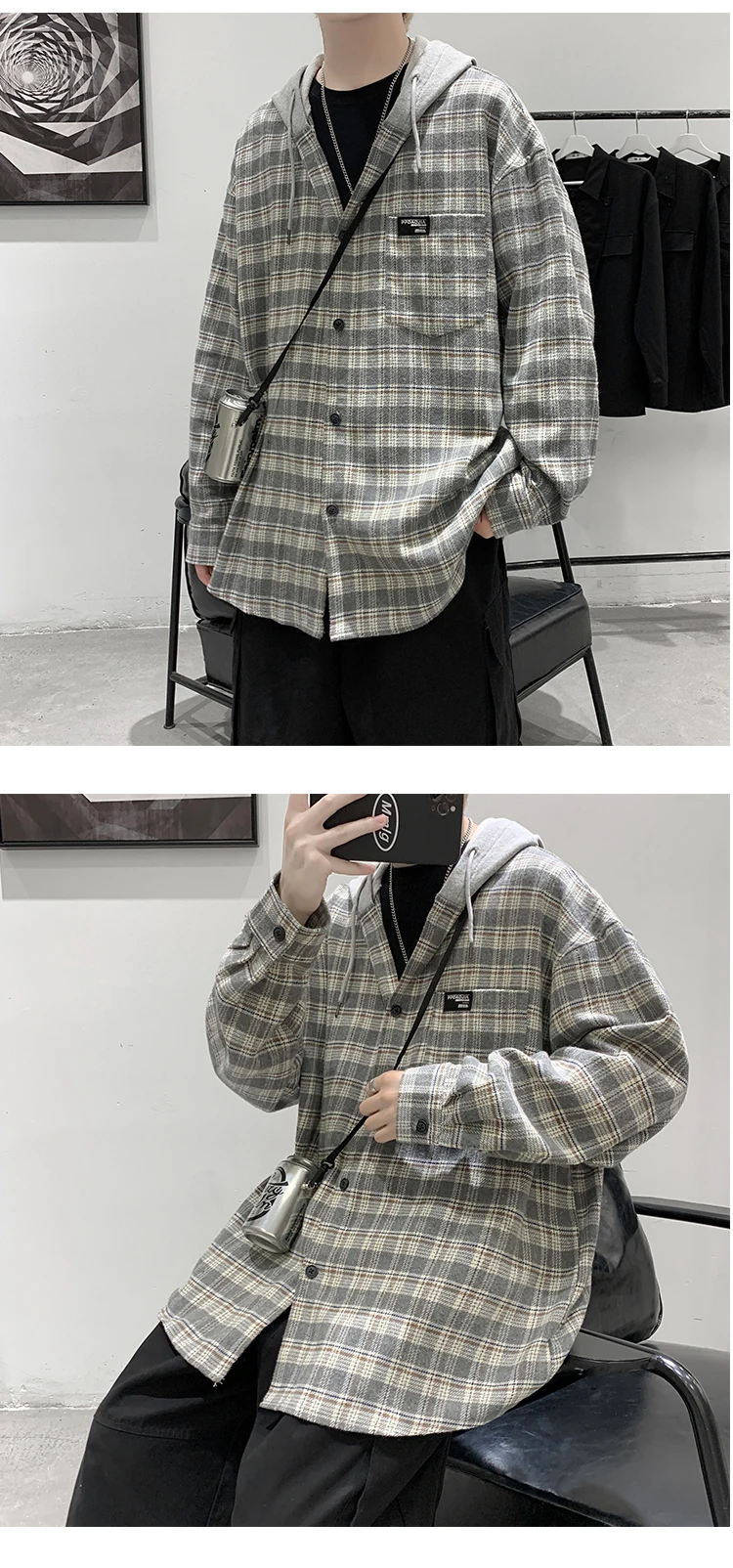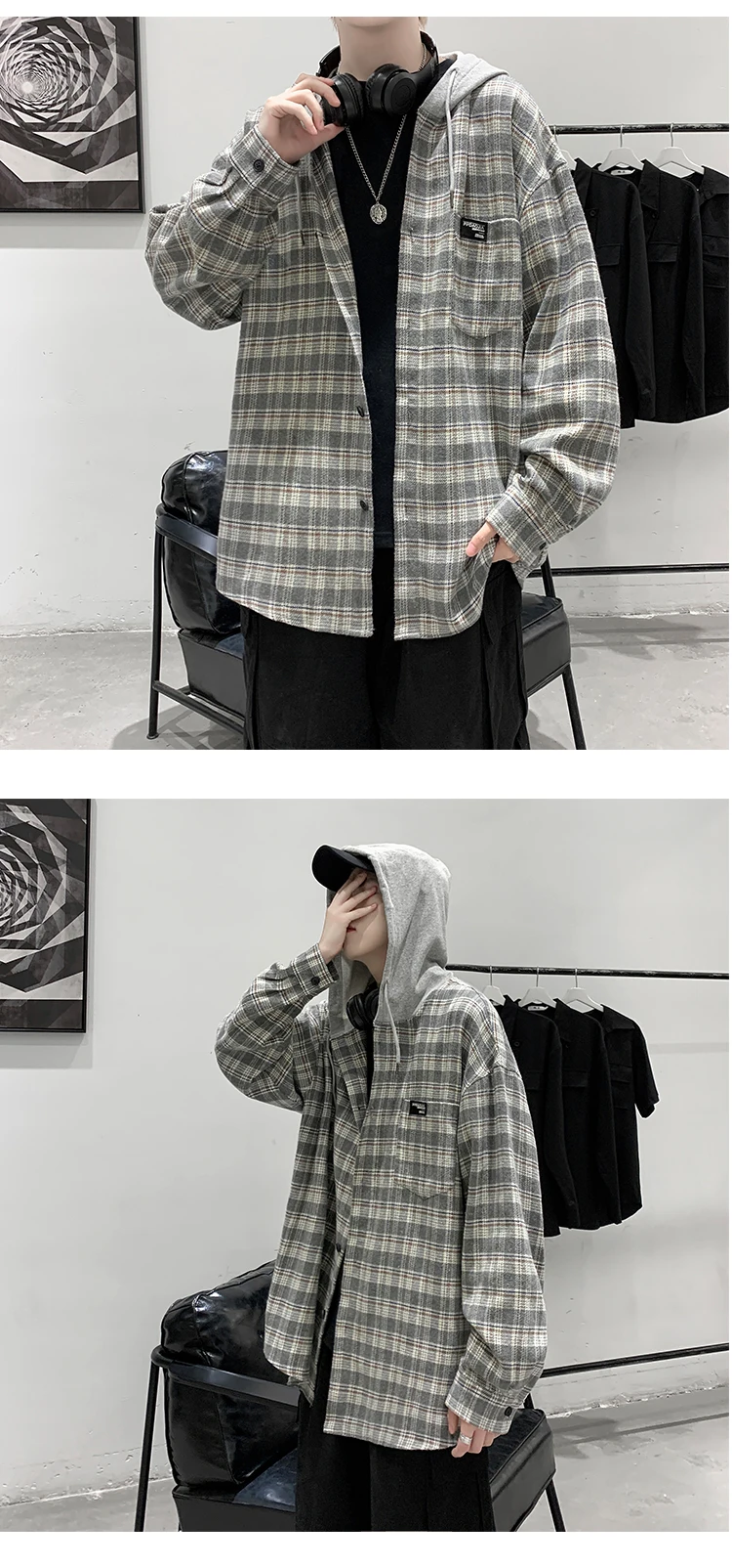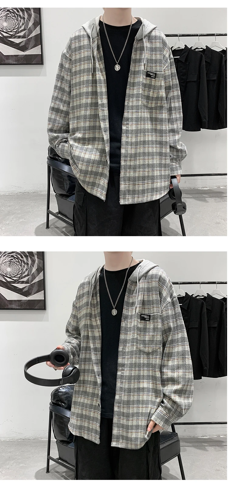Корейский шик с капюшоном фланелевые рубашки в клетку для мужчин 2021 Весна Осень Высокое качество хип-хоп повседневные мужские свободные уличные ретро рубашки