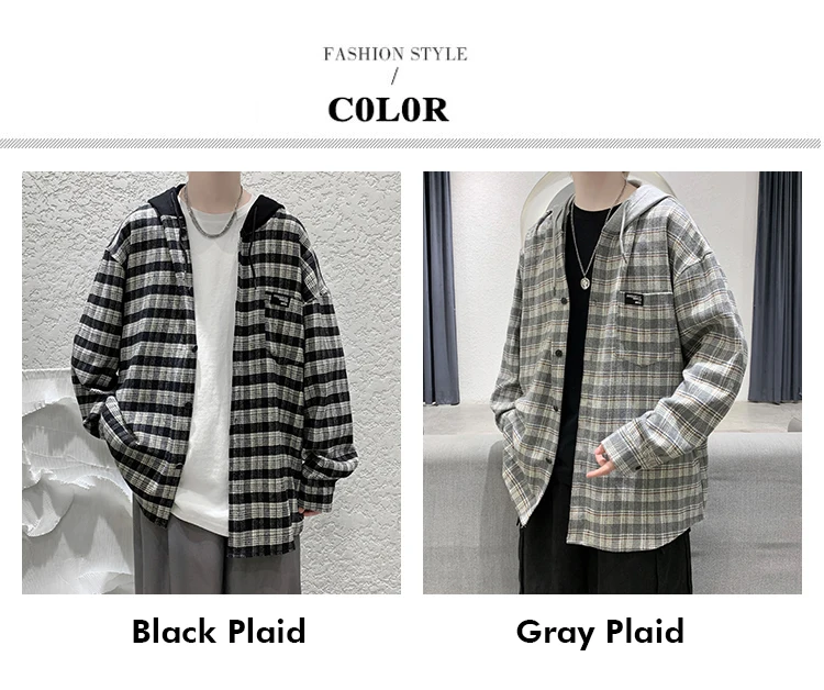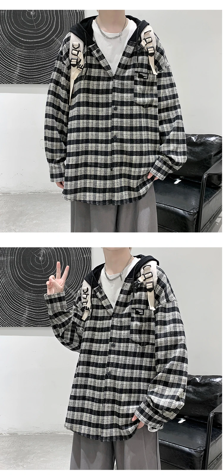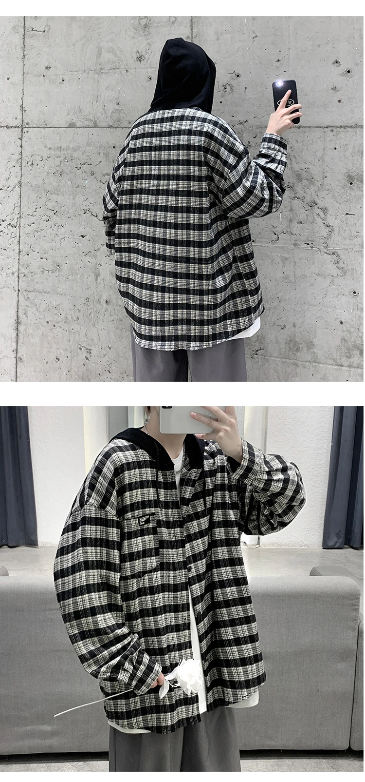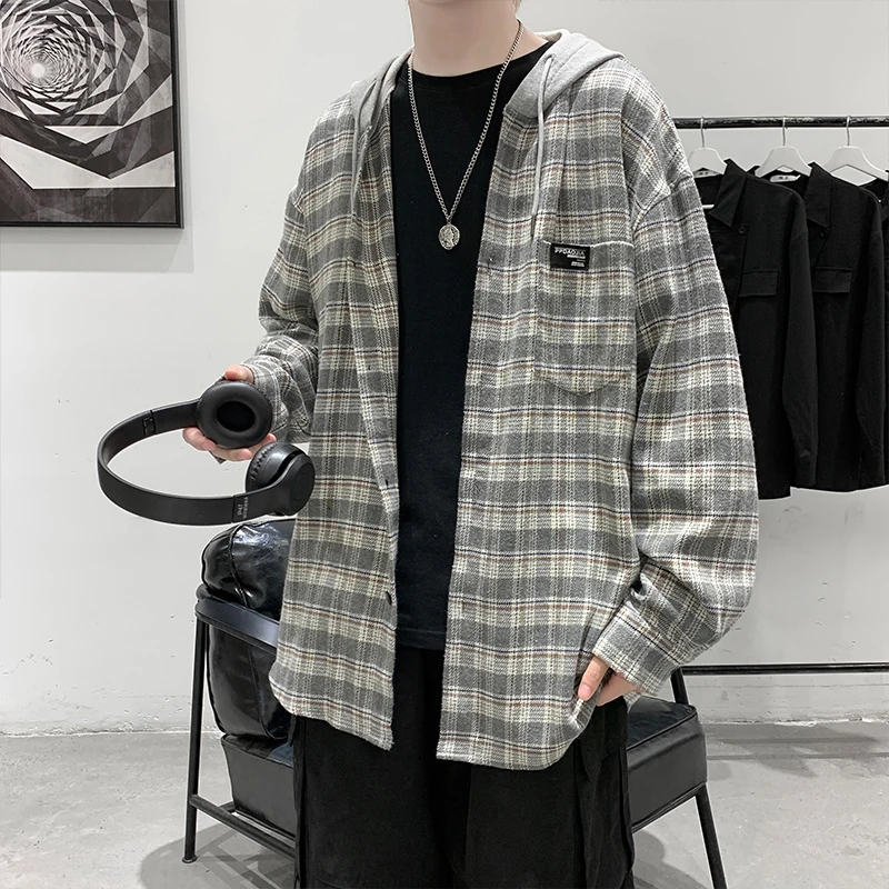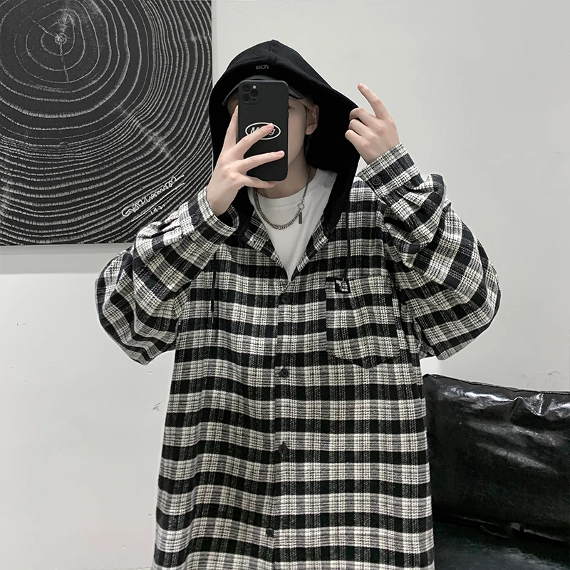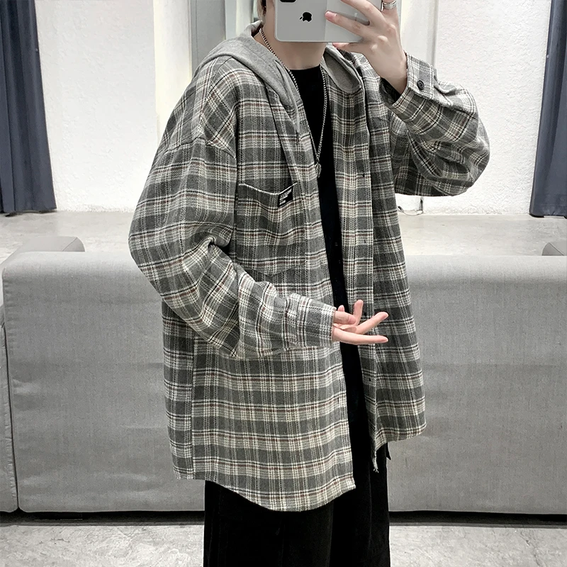 Корейский шик с капюшоном фланелевые рубашки в клетку для мужчин 2021 Весна Осень Высокое качество хип-хоп повседневные мужские свободные уличные ретро рубашки