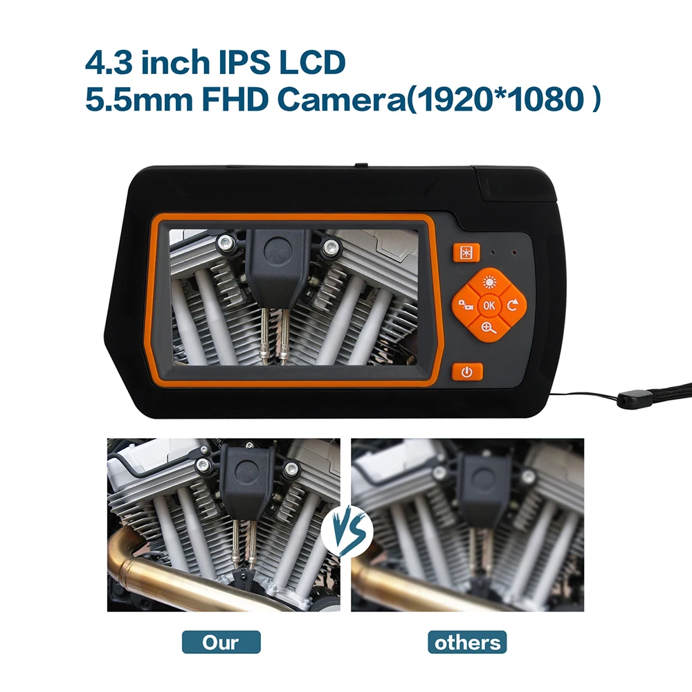 Монитор: 4,3-дюймовый цветной IPS экранРазрешение: 2,0 Мегапикселя HD 1920*1080PГоризонтальный угол обзора: 65 °Длина линии: 1 м/5 м/10 м/20 мФокусное расстояние: 1,2 дюйма-4 дюйма/3 см-10 смУровень водонепроницаемости: IP67Диаметр объектива: 3,9 мм/5,5 мм/8 мм/14,5 ммСветильник источник света: 6 светодиодный светильник s (регулируемый)Выносливость батареи: около 4-5 часов