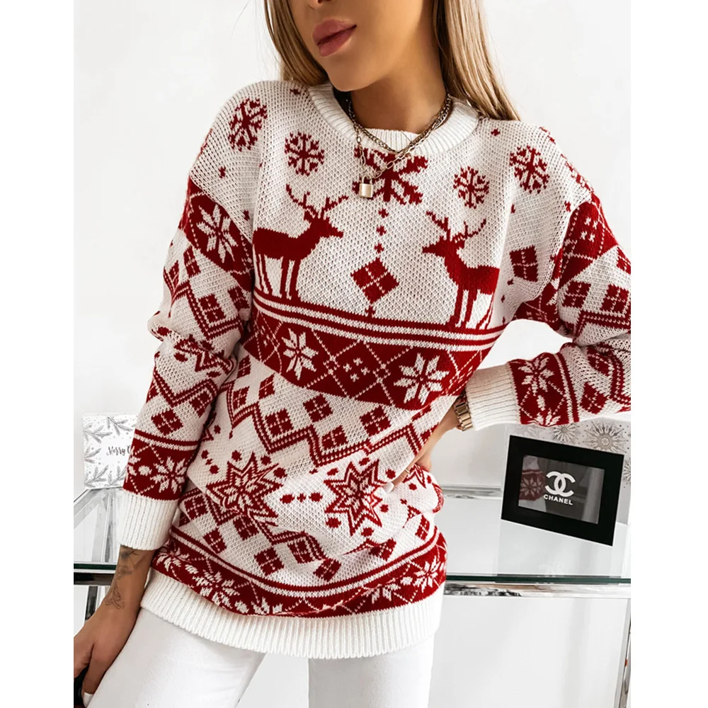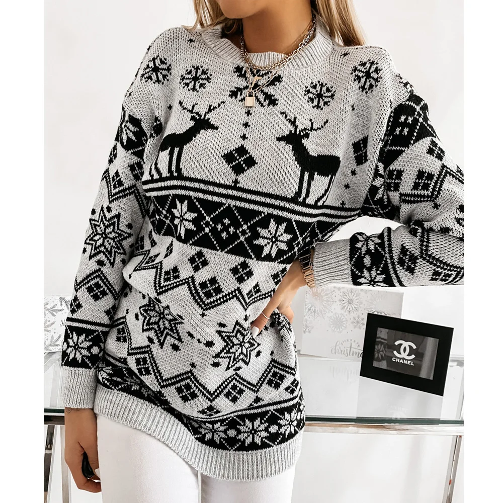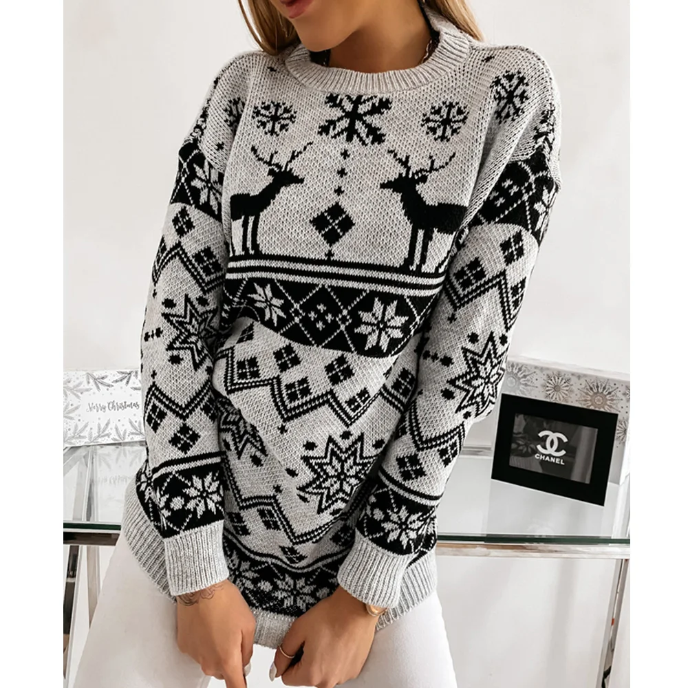 Женский Рождественский свитер, вязаный пуловер с круглым воротником и длинным рукавом, с рисунком снежинок и лося, топы, Женская осенне-зимняя одежда
