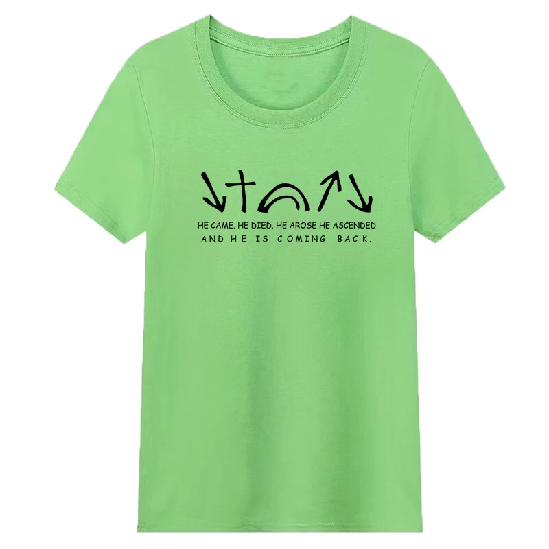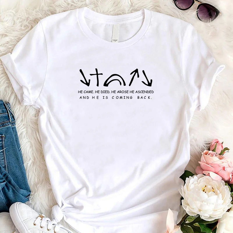 Он пришел, он скончался, он вознесся, и он возвращается, христианские религиозные футболки, женская футболка Иисуса Церкви, Прямая поставка