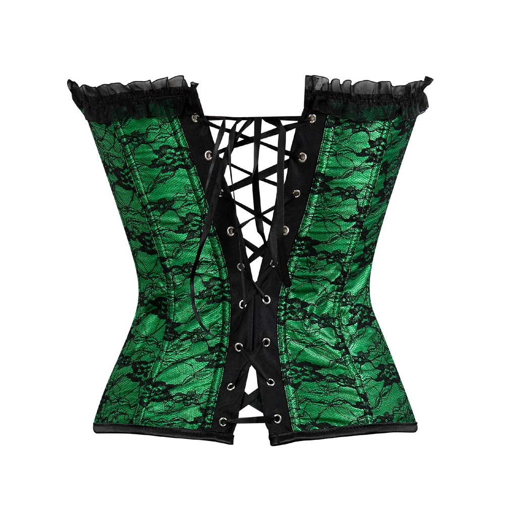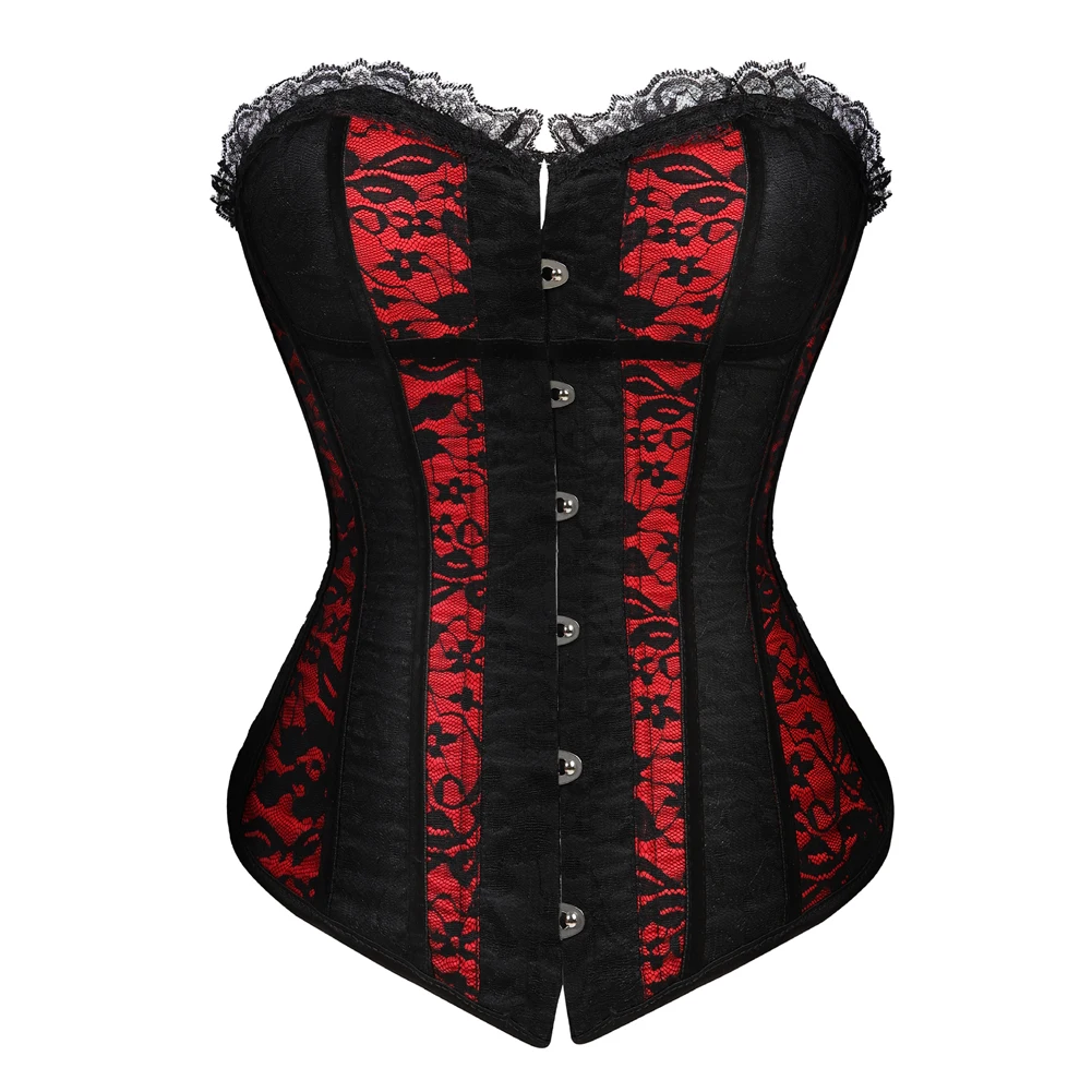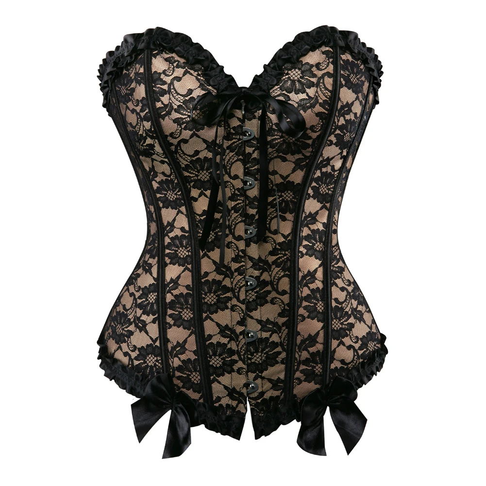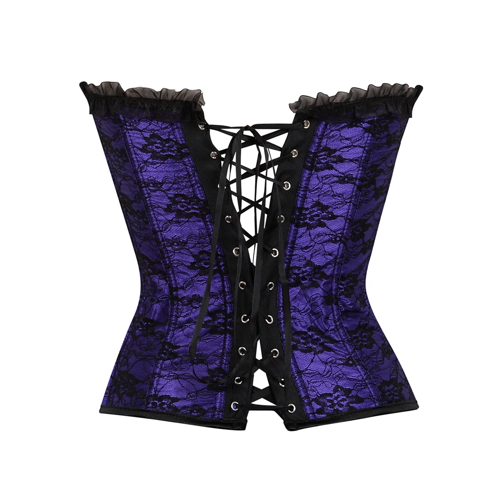 Сексуальные женские Корсеты с цветочным рисунком с черной кружевной отделкой корсет атласный Overbust Талия Cincher бюстье размера плюс