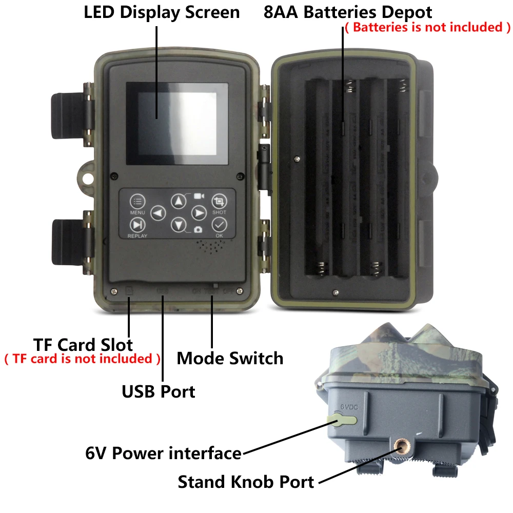 Несколько приложений и более длительный срок службы батареи-эта камера не просто широко используется для охоты на открытом воздухе, Скаутских игр и наблюдения за дикой природой, но также популярна в домашних условиях, на фермах и в офисе.До 6 месяцев в режиме ожидания. Энергопотребление в ночное время намного больше, чем в дневное время.С 8 батареями с полной энергией камера может делать 5000-10000 фотографий или снимать 1-2 часа видео в дневное время. И камера может сделать 1000-2000 фото или 0,5 часа видео в темное время суток.Мы рекомендуем использовать 8 новых и хорошего качества щелочных аккумуляторов AA для продления срока службы.