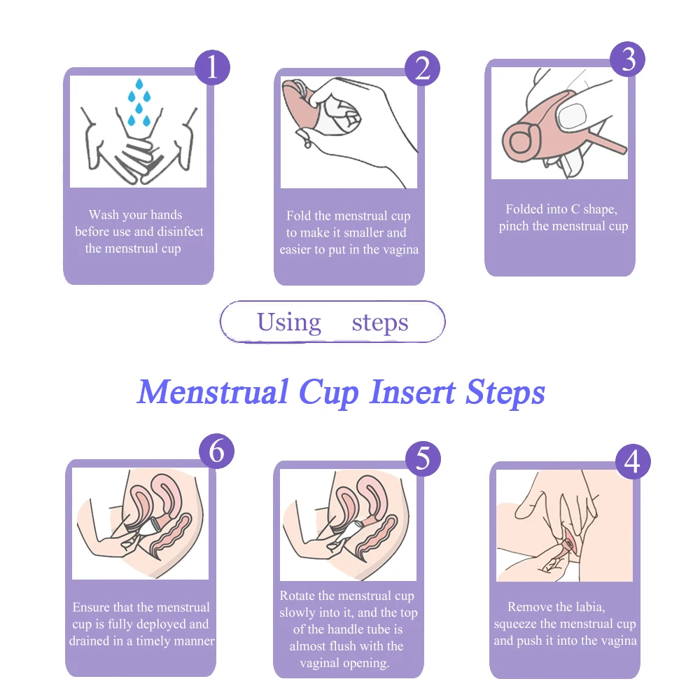 1. Перед использованием менструальной чашки убедитесь, что вы тщательно очистили руки и стерилизовали менструальную чашку перед первой вставкой.2. Рекомендуется вставить менструальную чашку в любое из следующих позиций: сидя, приседая, опускаясь на колени или стоя, попробуйте одну из этих позиций и выберите наиболее подходящую для вас.3. Чтобы облегчить вставку, вы можете увлажнить менструальную чашку водой или смазочным гелем при необходимости.4. Захватите менструальную чашку пальцами и нажмите. Затем Сложите менструальную чашку пополам, используя пальцы другой руки. Затем удерживайте менструальную чашку, используя пальцы одной руки в максимально низком положении.5. Вставьте менструальную чашку во влагалище, в обратную сторону.6. Правильное положение менструальной чашки ниже, чем тампоны. После введения во влагалище отпустите пальцы и дайте менструальной чашке полностью разворачиваться и приклеиться к вагинальной стенке.7. Вы можете дезинфицировать до и после использования.