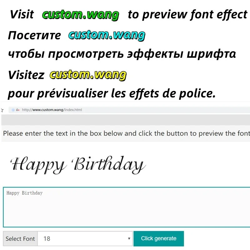 Пожалуйста, нажмите здесь, чтобы посетить www.custom.wang(Предварительный шрифт) 1. Введите текст, который вы хотите выгравировать