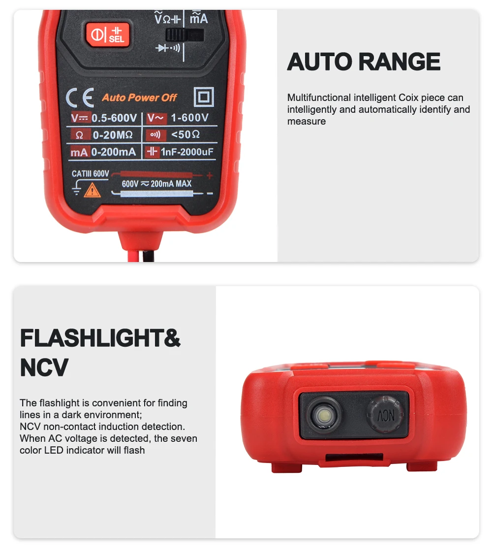 1. Этот измеритель представляет собой портативный цифровой мультиметр. Он имеет стабильную производительность, высокую точность, низкое энергопотребление, новую структуру, безопасность и надежность. Это идеальный счетчик для пользователей.2. Измеритель может измерять напряжение постоянного тока, напряжение переменного тока, сопротивление, непрерывность тестового зуммера; Он имеет функцию Бесконтактного обнаружения напряжения (NCV), незамедлительно напоминая пользователям обратить внимание на безопасную работу, делает пользователей более безопасными и уверенными.3. Этот мультиметр имеет автоматический диапазон, автоматическое отключение (около 15 минут без работы), подсветка, освещение и хранение данных, измерение живого провода, Предупреждение о низком напряжении, Частота дискретизации: около 3 раз в секунду, ЖК-дисплей: 3 1/24. Этот прибор спроектирован и изготовлен в строгом соответствии со стандартом безопасности IEC61010 и соответствует стандарту двойной изоляции и перенапряжения 600 В CAT III