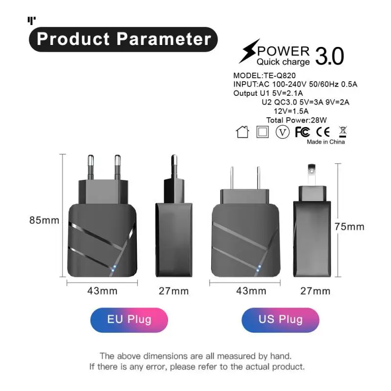 Входное напряжение: AC 100-240V 50/60Hz 0.5A Выход U1 5V-2.1A U2 QC3.0 5V-3A 9V-2A