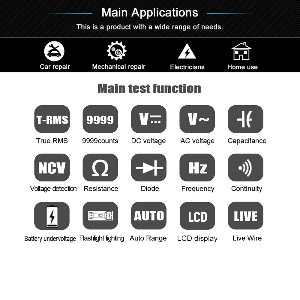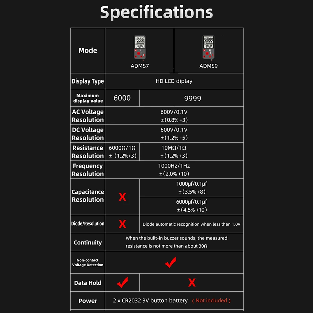 Особенности: Возможность Тестирования прямого тока/напряжения переменного тока, сопротивления, частоты, непрерывности и обеспечивает Обнаружение NCV и идентификацию провода в режиме реального времени. Оснащен 3,5-дюймовый большой экран, который показывает 6000 отсчетов четкие показания, легко читаемый. Ультратонкий дизайн, просто размер мобильного телефона, что делает его чрезвычайно портативным и легко носить с собой. Встроенный фонарик позволяет удобно использовать в ночное время или в темном уголке. Практичные функции, включая автоматическое измерение диапазона, защиту от перегрузки, Удержание данных и автоматическое отключение питания в течение 3 минут, если нет работы. Полезный инструмент для установки домашней цепи, ремонта электроники, обслуживания электрических объектов, ремонта автомобилей, ремонта бытовой техники. Характеристики: Бренд: BSIDE Модель: ADMS7 / ADMS9 (опционально) Материал: АБС-пластик Мощность питания: 2 х кнопочная ячейка CR2032 3V (не входит в комплект) Модель (опционально) ADMS7 ADMS9 Напряжение прямого тока 600V/0,1 V ±(1.2% + 5) Напряжение переменного тока 600V/0,1 V ±(0.8% + 3) Сопротивление 6000Ω/1Ω ±(1.2% + 3) 10 м Ом/1 Ом ±(1.2% + 3) Частота 1000 Гц/1 Гц ±(2.0% + 10) Емкость N/A 1000 мкФ/0,1 мкФ ±(3.5% + 8) 6000 мкФ/0,1 мкФ ±(4.5% + 10) Диод N/A Да Непрерывность При звуке встроенного зуммера измеренное сопротивление составляет не более 30 Ом Обнаружение NCV Да Хранение данных Да N/A Экран дисплея HD ЖК-дисплей экран (3,5 дюйма) Счетчик дисплея 6000 штук 9999 подсчетов Размер изделия: 140*71*15,5 мм/5,51*2,79 * 0.61in Вес изделия: 110 г/3,88 унций Вес посылка: 186 г/6,56 унций Размер посылка: 16,3*7,3*3,7 см/6,41*2,87 * 1.45in Упаковочный лист: 1 * Цифровой мультиметр 1 * пара тестовых проводов 1 * Руководство пользователя (на английском языке)