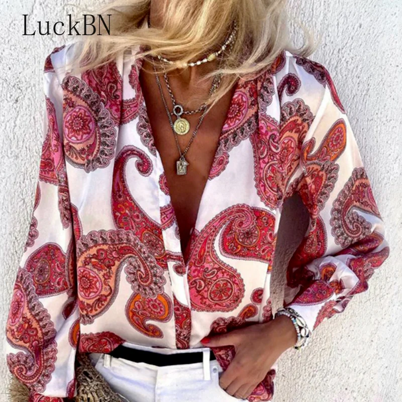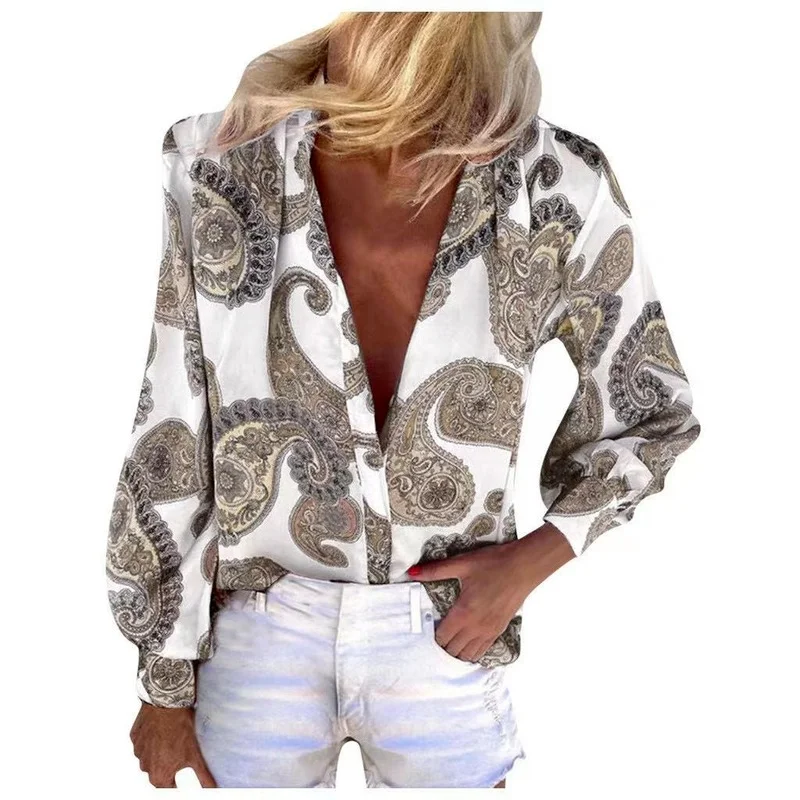 Женская офисная блузка с длинным рукавом, V-образным вырезом и цветочным принтом