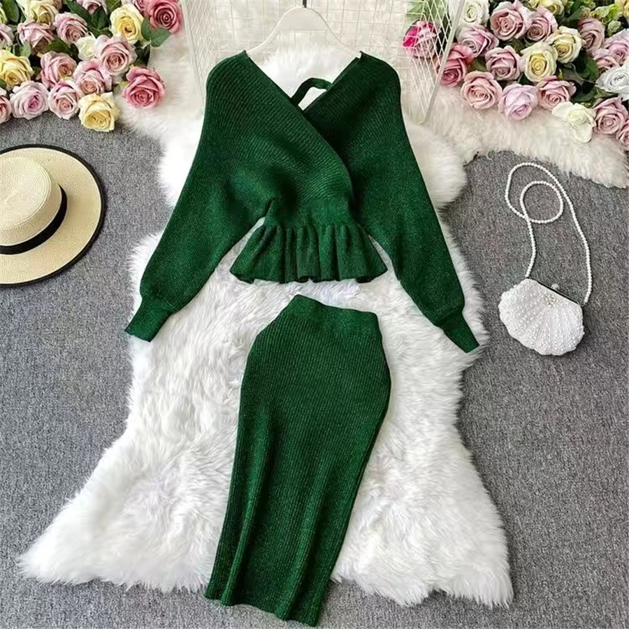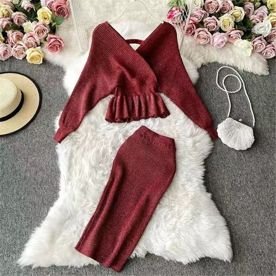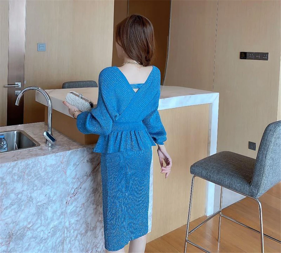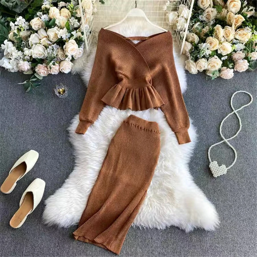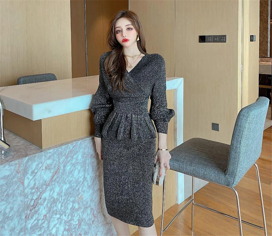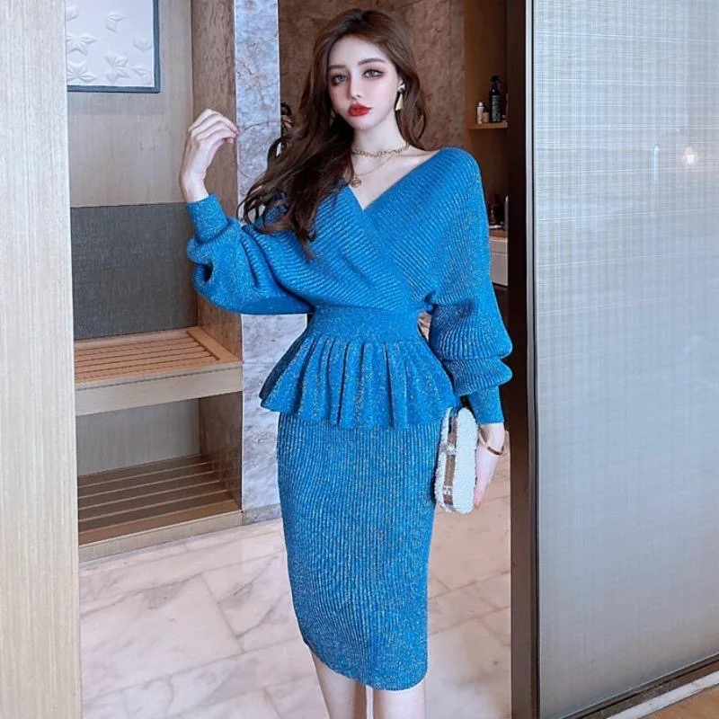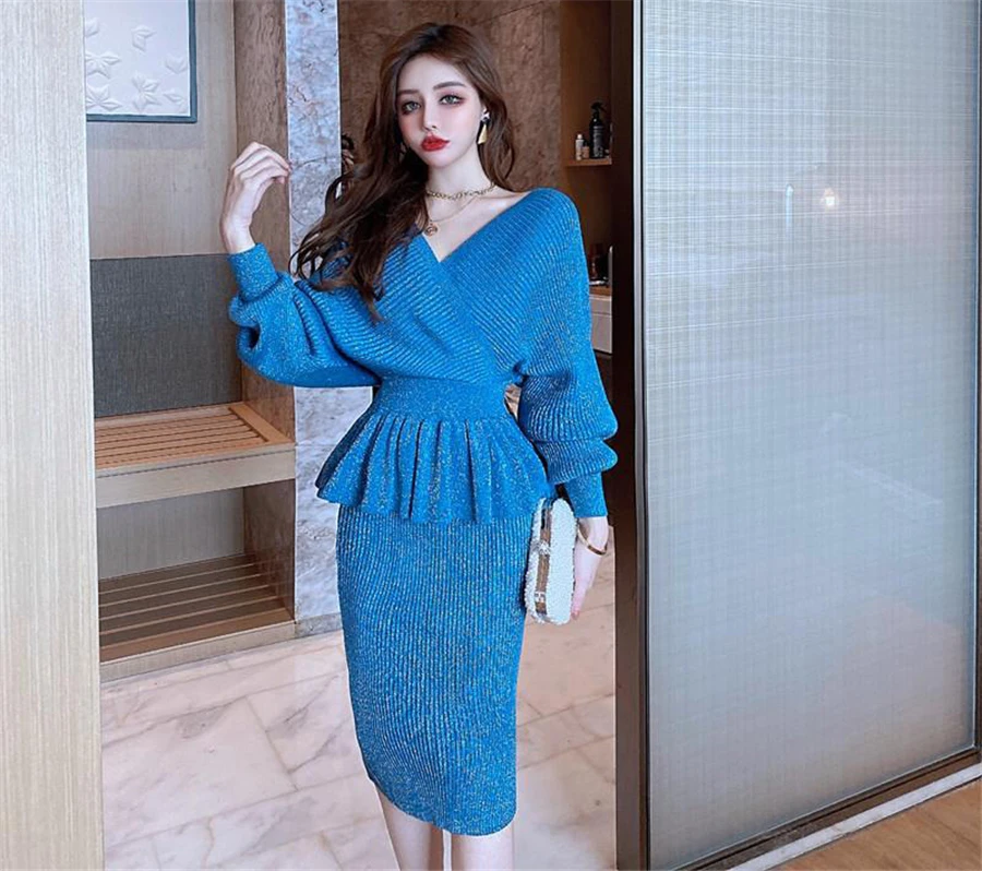 women chic slim knitted Tracksuitkorean Short pullover sweater+bodycon skirts