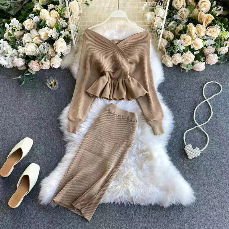 2021 New female Two piece sestsfashion Ruffle Knitted solid suits