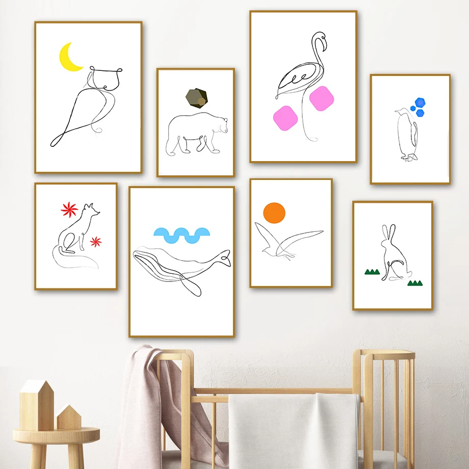 Лев, жираф, слон линия животных Детская настенная Картина на холсте...