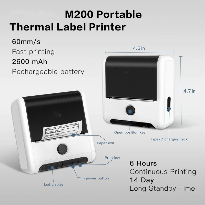 Характеристика:☀1. Встроенный 2600amh аккумулятор с интерфейсом Type-C, принтер может работать непрерывно в течение 6 часов, 50 мм/сек. быстрая печать и две недели в режиме ожидания.☀2. Принтер этикеток M200 может печатать этикетки шириной до 80 мм и поддерживает Печать Термоэтикеток, прозрачных этикеток и термобумаги. Очень подходящие этикетки, значки или конверты для печати, адресные этикетки, этикетки для доставки, этикетки для ювелирных изделий, этикетки для розничной торговли/продукта, штрих-код QR, даты, ies и т. д.☀3. Легко Подключайтесь к мобильным устройствам через Bluetooth (для iOS и Android), загрузите бесплатное приложение «Print Master» и Распечатайте непосредственно со своего смартфона или планшета, или если вы хотите напечатать с настольного компьютера, принтер этикеток M200 совместим с системой Windows и печатью.☀4. Мощная функция оптического распознавания OCR может преобразовать текст на фотографии в персонализированный текст. При проектировании и печати вы можете легко добавлять этикетки, логотипы, текст, ies и даже qr-коды.☀5. Принтер термопечати M200 использует передовую технологию термопечати для печати без тонера или чернил. Автоматическое распознавание этикеток делает печать более быстрой и гладкой. Повышает эффективность печати и экономит время. Высокое разрешение и четкое качество печати 203 точек/дюйм обеспечивают идеальное качество печати.Характеристики:Тип печати: печать без чернилСпецификация емкости бумаги: 20-75 ммВес посылка: 516 гБатарея: литиевая батарея (встроенный)Интерфейс: 5 В, micro USBРазрешение: 203 точек/дюймСистема поддержки: для iOS 8,0 + Android 4,0 или вышеПосылка:Phomemo-M200 принтер этикеток * 1USB кабель * 1Термопечатная бумага (внутри принтера) * 1Руководство пользователя * 1Упаковочная коробка * 1